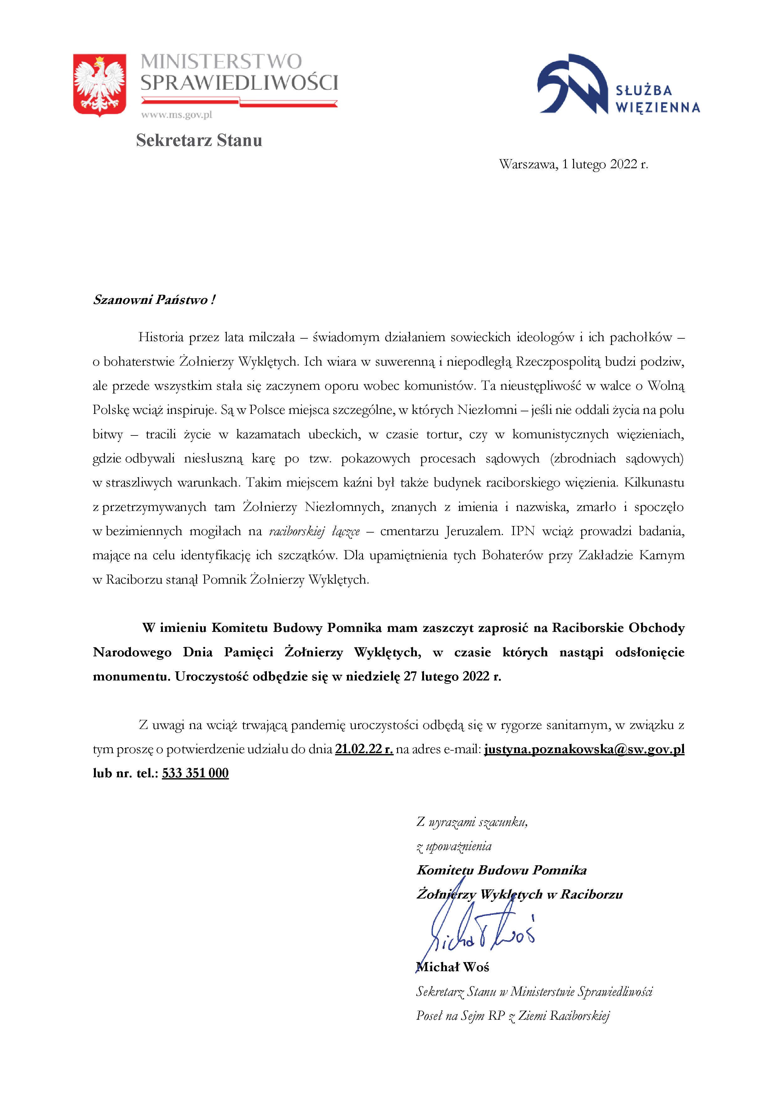 w imieniu Sekretarza Stanu w Ministerstwie Sprawiedliwości Pana Ministra Michała Wosia oraz Komitetu Budowy Pomnika, w ślad za przekazanym za pośrednictwem poczty pismem, w załączeniu przesyłam skan zaproszenia na uroczystość odsłonięcia Pomnika Żołnierzy Wyklętych w Raciborzu, która będzie miała miejsce w niedzielę 27 lutego br. w ramach Raciborskich Obchodów Narodowego Dnia Pamięci Żołnierzy Wyklętych.