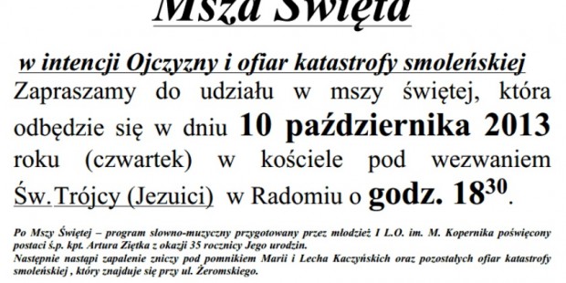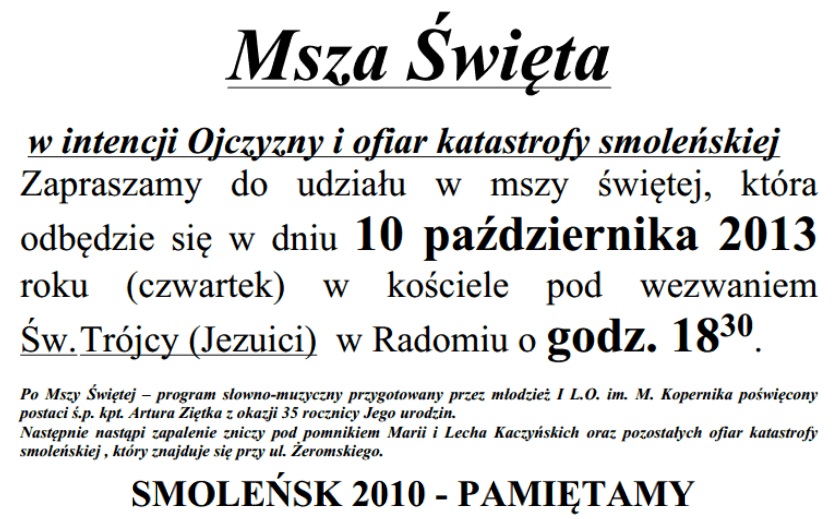 Radom – Msza Św. w intencji Ojczyzny i Ofiar tragedii smoleńskiej, 10 października, g. 18.30, Kościół pw. Św. Trójcy (Jezuici). Po Mszy – program słowno-muzyczny przygotowany przez młodzież I L.O. im. M. Kopernika poświęcony postaci śp. kpt. Artura Ziętka z okazji 35 rocznicy Jego urodzin. Następnie nastąpi zapalenie zniczy pod pomnikiem Marii i Lecha Kaczyńskich oraz pozostałych Ofiar przy ul. Żeromskiego.