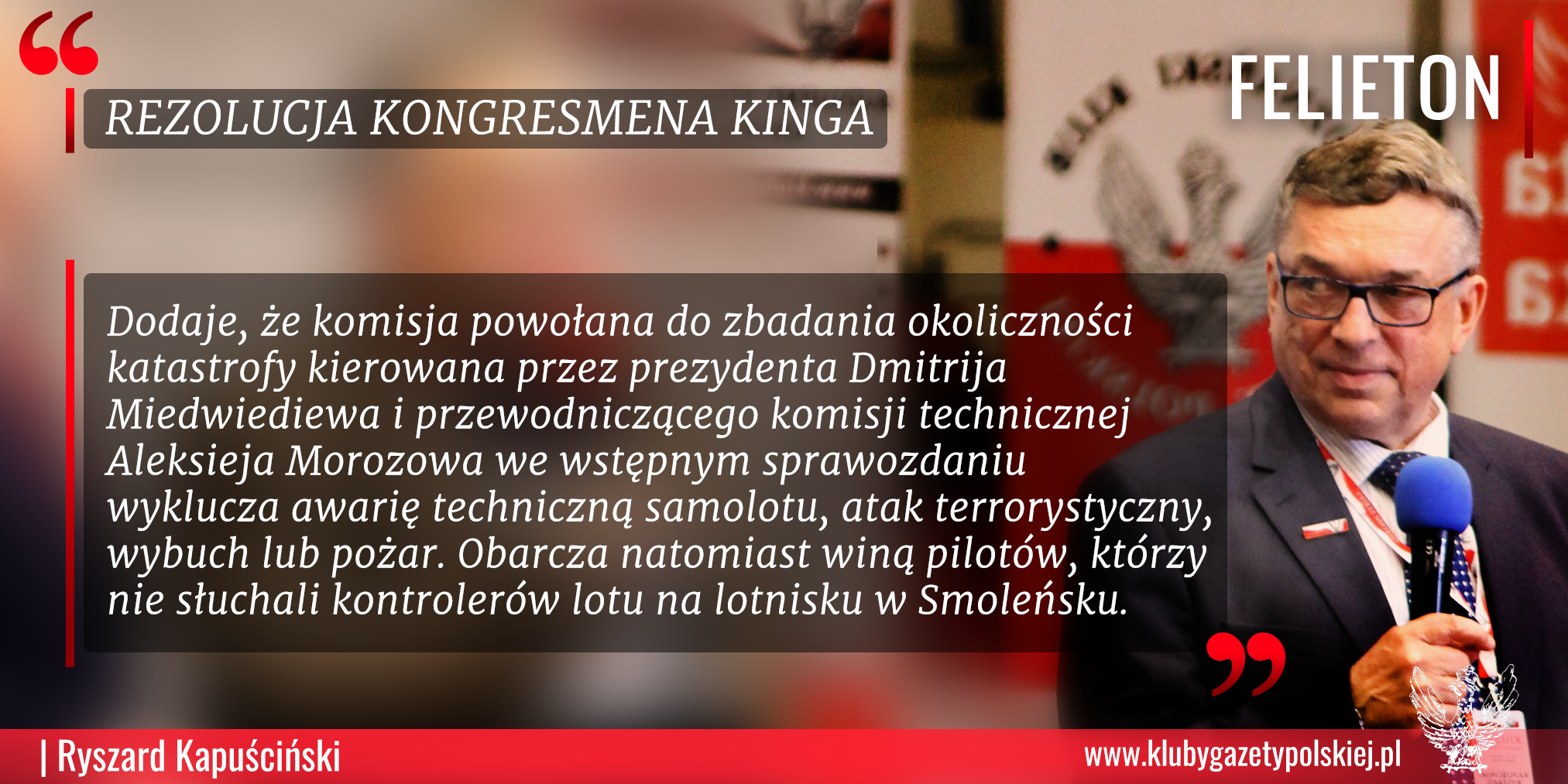 30 czerwca 2010 r. w Kongresie USA złożono projekt rezolucji wzywającej do ustanowienia międzynarodowej niezależnej komisji, której zadaniem byłoby zbadanie przyczyn katastrofy smoleńskiej. Rezolucję H.RES.1489 zgłosił Peter T. King, republikański kongresmen. W rezolucji stwierdza, że pod Smoleńskiem zginęli: prezydent Lech Kaczyński, szef polskiego Sztabu Generalnego i wyżsi oficerowie wojskowi Polski, wysocy przedstawiciele Kościoła oraz krewni ofiar pomordowanych pod Katyniem. Dodaje, że komisja powołana do zbadania okoliczności katastrofy kierowana przez prezydenta Dmitrija Miedwiediewa i przewodniczącego komisji technicznej Aleksieja Morozowa we wstępnym sprawozdaniu wyklucza awarię techniczną samolotu, atak terrorystyczny, wybuch lub pożar. Obarcza natomiast winą pilotów, którzy nie słuchali kontrolerów lotu na lotnisku w Smoleńsku. Zabroniono polskim ekspertom dostępu do miejsca katastrofy, nie wydano oryginałów czarnych skrzynek, udostępniono tylko ich kopie. Niestety, szybko się okazało, że inicjatywa Petera T. Kinga spowodowana była tylko chęcią zdobycia głosów Polonii w zbliżających się wyborach do Kongresu USA. Po wygranych wyborach już nikt nigdy nie podjął tego tematu!
