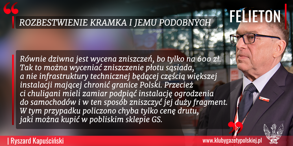 Sąd Rejonowy w Sokółce odrzucił wniosek o areszt dla Bartosza Kramka i jego kumpli za zniszczenie zabezpieczeń na granicy z Białorusią. Wprawdzie wszystkim 13 zatrzymanym postawione zostały zarzuty, jednak sąd zakwalifikował to jako występek o charakterze chuligańskim. To dziwna interpretacja prawa, ponieważ art. 277 Kodeksu karnego mówi wprost: „Kto znaki graniczne niszczy, uszkadza, usuwa, przesuwa lub czyni niewidocznymi albo fałszywie wystawia, podlega grzywnie, karze ograniczenia wolności albo pozbawienia wolności do lat 2”. Z tego artykułu w 2020 r. wszczęto 341 postępowań dotyczących niszczenia znaków granicznych. Równie dziwna jest wycena zniszczeń, bo tylko na 600 zł. Tak to można wyceniać zniszczenie płotu sąsiada, a nie infrastruktury technicznej będącej częścią większej instalacji mającej chronić granice Polski. Przecież ci chuligani mieli zamiar podpiąć instalację ogrodzenia do samochodów i w ten sposób zniszczyć jej duży fragment. W tym przypadku policzono chyba tylko cenę drutu, jaki można kupić w pobliskim sklepie GS. Dlatego nie ma się co dziwić Kramkowi, który komentując decyzję sądu, powiedział: „Nie mamy żadnych ograniczeń i możemy planować kolejne akcje”.