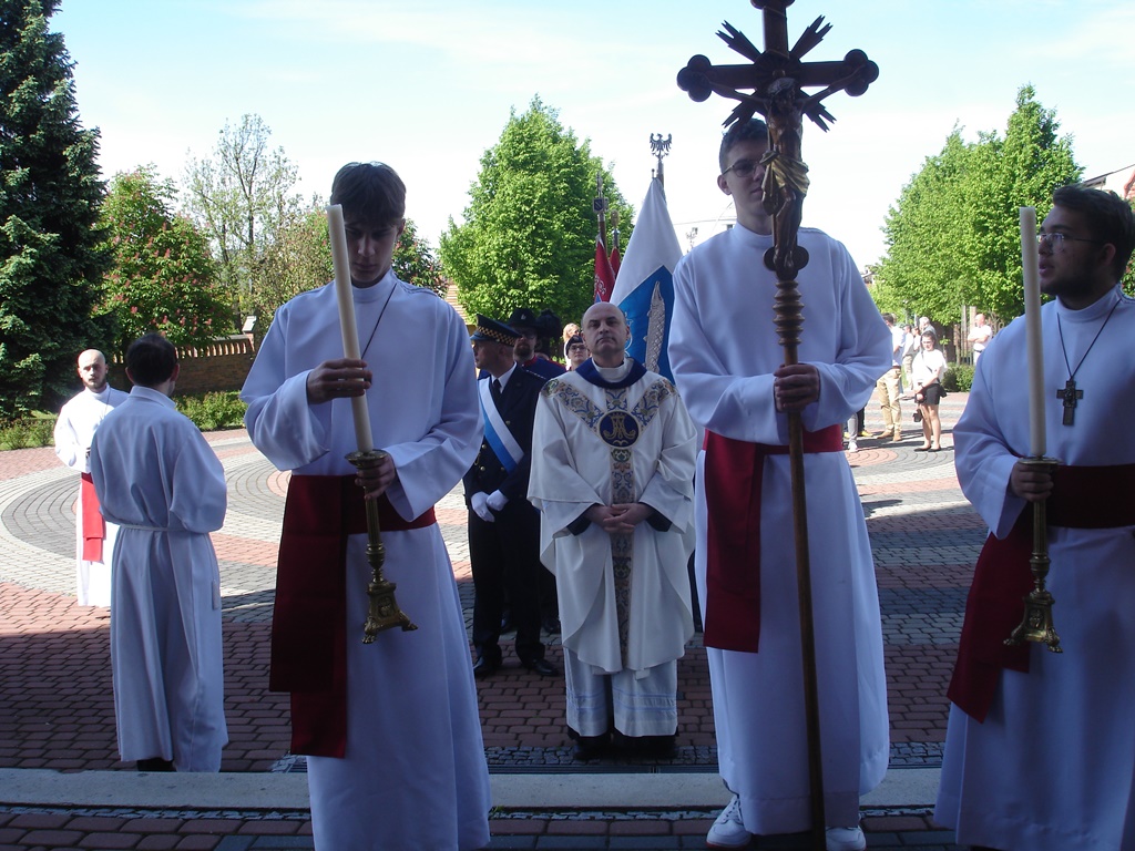Obchody 3 Maja w Rybniku rozpoczęły się uroczystą mszą świętą w intencji Ojczyzny w bazylice św. Antoniego z udziałem parlamentarzystów, władz miasta, pocztów sztandarowych, szkół, harcerzy, służb mundurowych, kombatantów oraz mieszkańców Rybnika. Mszę św. sprawował proboszcz parafii Marek Bernacki, który wygłosił homilię religijno-patriotyczną. Gospodarz bazyliki prosił, żeby w dzisiejszej uroczystości modlić się, słuchając Słowa Bożego i gorliwie uczestniczyć w Eucharystii, która jest tajemnicą wiary. O niej najwięcej mówił wielebny swoim patafianom i przybyłym gościom. –„Wiara góry przenosi”, w życiu codziennym to wyrażenie oznacza najczęściej wiarę we własne możliwości, co ma podnieść na duchu: dodać odwagi wobec różnych wyzwań. Wiara oznacza osobistą, głęboką i wyjątkową relację z Jezusem. Jak skuteczna jest wiara? – pytał. Jest taka gdy człowiek przyjmuje obecność Boga w swoim życiu z prostotą i ufa jego mocy. Wiara to nasze korzenie i tożsamość – wołał z wielką mocą. Przypomniał, że tak niedawno odszedł do Domu Pana – Wielki Syn Polski Sługa Boży papież Jan Paweł II, który obalał mury wrogości i nienawiści – był orędownikiem pokoju i przyjacielem człowieka . Jesteśmy dumni z niego bo rozsławił Polskę, , przysłużył się do tego, ze nasza Ojczyzna jest dziś wolna. Przywołał także postać bł. Prymasa Stefana Wyszyńskiego, który tak dobrze rozumiał, że Maryja jest tą, która zawsze przynosi człowiekowi wolność. Mówiąc o Golgocie użył przenośni. Golgota /czaszka/ jt. Wzgórze znajdujące się nieopodal Jerozolimy, gdzie dokonywano egzekucji skazańców. Na Golgocie dokonała się Męka Pańska – ukrzyżowanie Jezusa Chrystusa wraz z dwoma złoczyńcami. W przypadku Jezusa, egzekucja poprzedziła Droga Krzyżowa. – Golgota nie znikła, lecz powtarza się w różnych miejscach świata, gdzie ludzie staja przed wyborem dobra lub zła. Również dzisiaj Jezus „potrzebuje” ludzi stojących razem z Maryją pod krzyżem i dających się Bogu prowadzić – zakończył > Podczas kazania parokrotnie prosił zebranych o odmawianie „zdrowaśki” – „odmawiajmy – nie wstydźmy się” . Homilia była wielkim apelem o naszą wierność Ojczyźnie. Kazanie otwierało oczy na Pismo Święte. Przekonanie o wyjątkowej wartości takich darów Bożych jak wiara własna, niepodległa Ojczyzna jej pomyślność i bezpieczeństwo. Każda z tych wartości była i jest bezustannie zagrożona, każdej trzeba bronić . Konieczność walki w obronie własnej wiary i wolności rodziła postawę szacunku i tolerancji wobec tych samych postaw u innych narodów, co było tak charakterystyczne dla Polski okresu Rzeczpospolitej Obojga Narodów. Przyszły później lata tragicznych doświadczeń, gdy niepodległej, własnej państwowości nie udało się utrzymać. Każdemu Polakowi pozostała wówczas jedynie wolność ducha: wiara, której utrzymanie mogło stać się drogą przywrócenia wolności Ojczyzny. Utrzymanie jej stało się zatem podstawowym zadaniem Polaka, często rzucanego przez los daleko od ojczystego kraju, domu i bliskich. Kraj cierpiał, cierpiał także każdy syn i córka umęczonego narodu. Naród doświadczony został wyjątkowo bolesnym cierpieniem i w tym widział dowód Bożego wybrania. Dziś także wolność, prawda, sprawiedliwość i wiara podlegają zagrożeniu. Od każdego z nas domaga się ich obrony. Stajemy często bezradni wobec przemocy, kłamstwa i niesprawiedliwości. Powszechny entuzjazm i podziw budzi wiara naszego Narodu, szczere i głębokie oddanie Matce Bożej, odważnie bronienie godności i praw człowieka, rodzące dogłębna solidarność całego społeczeństwa. W dzisiejszym, bardzo zróżnicowanym świecie, świadectwo nasze musi stać się jeszcze bardziej czytelne i konsekwentne. Módlmy się za naród Maryjo Królowo Polski przyjmij modlitwę za ukochaną Ojczyznę . Jeszcze raz dziękował wszystkim wiernym za liczny udział w Maryjnym nabożeństwie. Zakończył z wdzięcznością i błogosławieństwem.