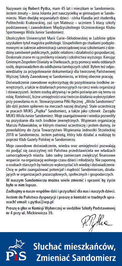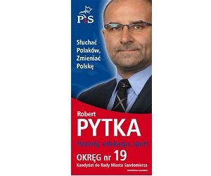 [Sandomierz] Robert Pytka – kandydat do Rady Miasta [Sandomierz] Robert Pytka – kandydat do Rady Miasta lis 10, 2014 Kluby GP Sandomierz Tagged PIS, Sandomierz, wybory Wstecz [Siedlce] Ewa Patkowska- Grzejdziak – kandydatka do Rady Powiatu Dalej „MOJA MAŁA OJCZYZNA OCALIĆ OD ZAPOMNIENIA LUDZI, MIEJSCA, WYDARZENIA”. SYLWETKA.