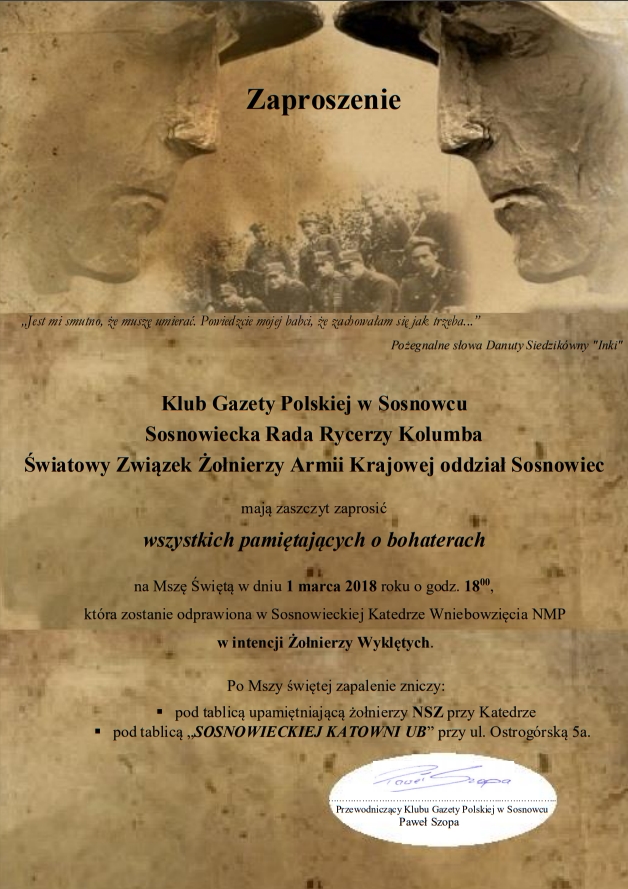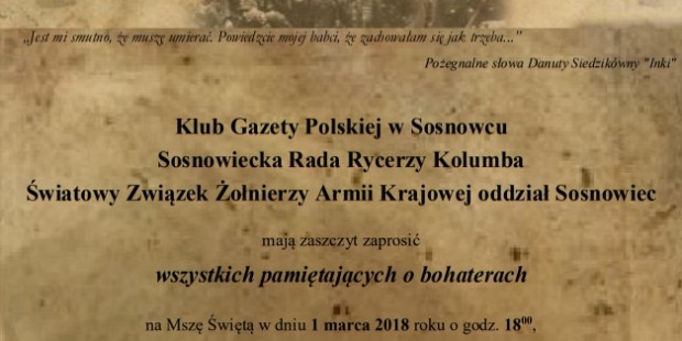 Klub Gazety Polskiej w Sosnowcu mają zaszczyt zaprosić wszystkich pamiętających o bohaterach na Mszę Świętą w dniu 1 marca 2018 roku o godz. 18.00, która zostanie odprawiona w Sosnowieckiej Katedrze Wniebowzięcia NMP w intencji Żołnierzy Wyklętych.