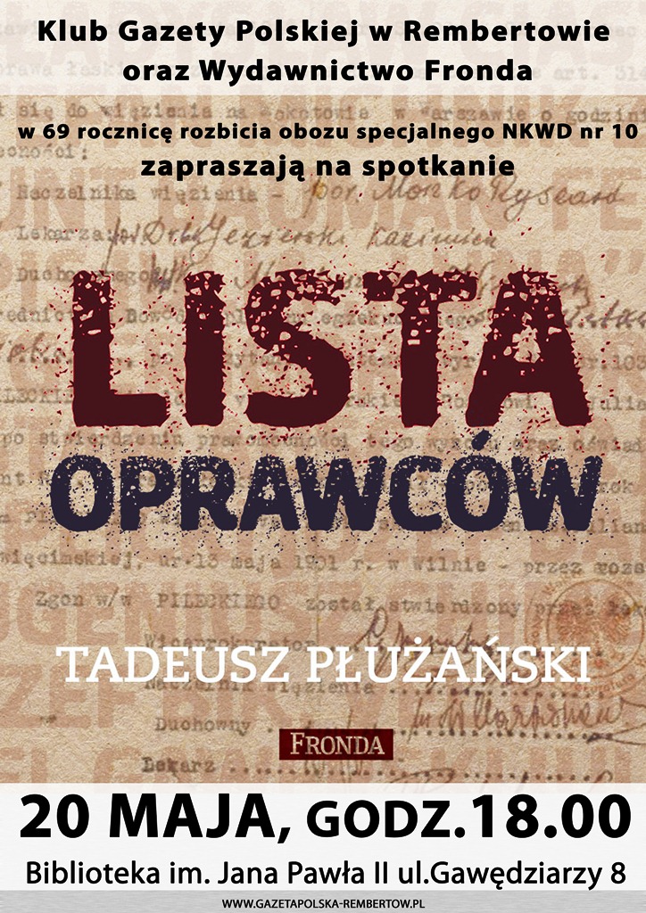 Warszawa Rembertów – w 69 rocznicę rozbicia obozu NKWD nr 10 odbędzie się spotkanie dyskusyjne z publicystą, historykiem Tadeuszem Płużańskim, połączone z prezentacją książki „Lista Oprawców” , 20 maja, g. 18, Biblioteka Publiczna ul. Gawędziarzy 8 (obok Ratusza w Rembertowie).