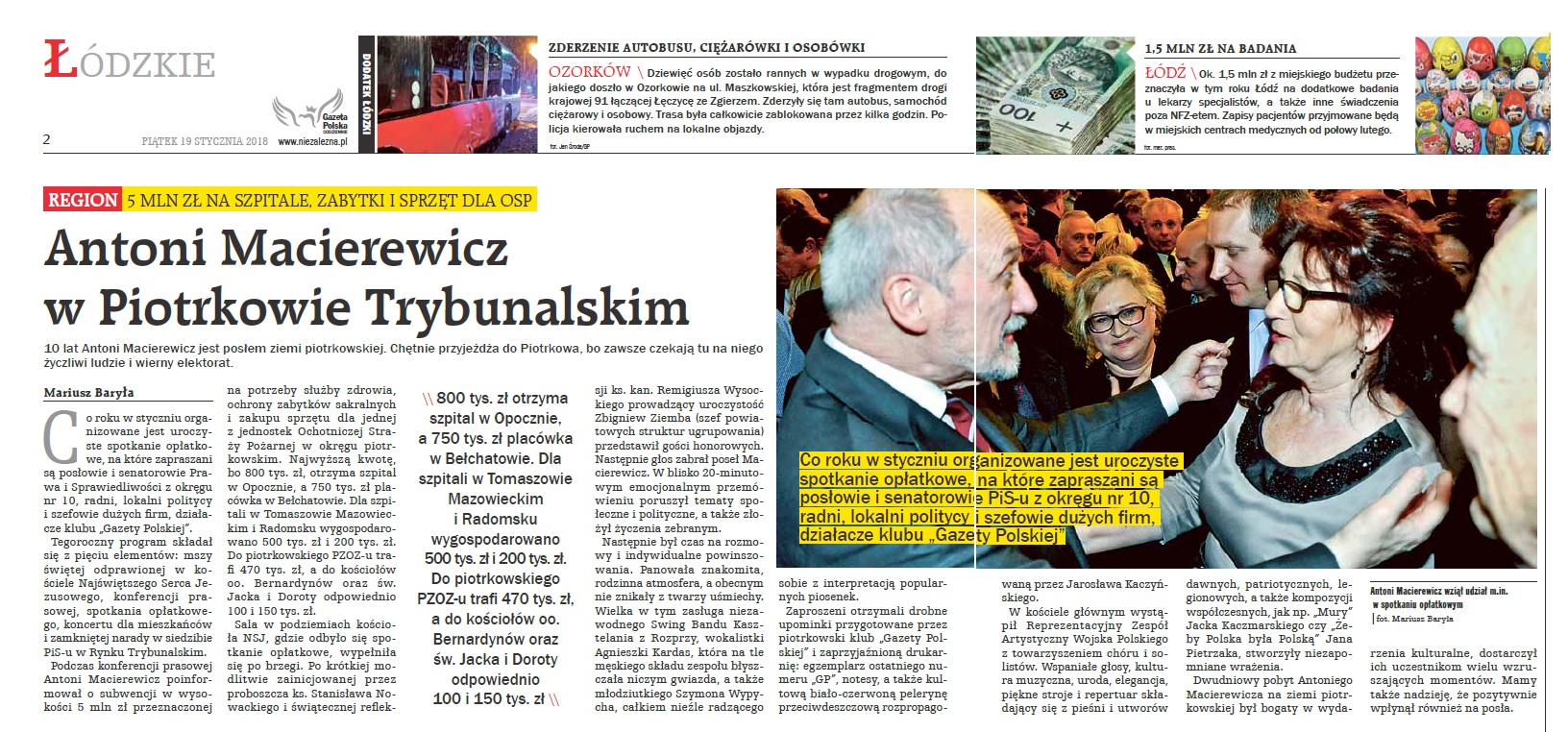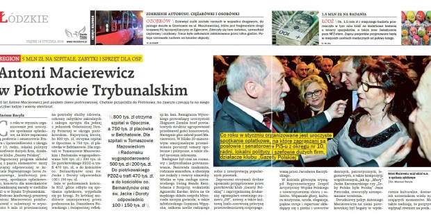 Podczas konferencji zroszeni parlamentarzyści złożyli krótkie oświadczenia. A. Macierewicz poinformował o subwencji w wysokości 5 mln złotych przeznaczonej na potrzeby służby zdrowia, ochrony zabytków sakralnych i zakupu sprzętu dla jednej z jednostek Ochotniczej Straży Pożarnej. Najwyższą kwotę, bo 800 tys. złotych otrzyma szpital w Opocznie, nie mniej, bo 750 tys. placówka w Bełchatowie; dla szpitali w Tomaszowie i Radomsku wygospodarowano 500 i 200 tys. Do piotrkowskiego PZOZ trafi 470 tys., a do kościołów: oo. Bernardynów i św. Jacka i Doroty odpowiednio 100 i 150 tys. złotych.