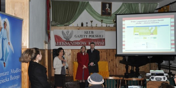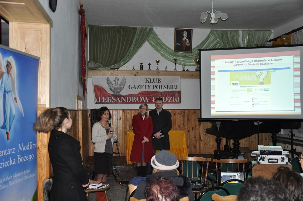 W sobotę 8-go lutego w Aleksandrowie Łódzkim w sali Tow. Śpiewaczego „Lutnia” odbyło się spotkanie poświęcone zagrożeniom wobec dzieci i rodziny ze strony ideologii gender. Spotkanie zorganizował miejscowy Klub Gazety Polskiej, a głównymi prelegentami byli państwo Magdalena i Piotr Ogrodowczykowie, twórcy Forum Rodziców i Wychowawców „NIE SZKODZIĆ”. W swoim wykładzie, po przybliżeniu ogólnego zarysu tematyki spotkania, szczegółowo omówili kwestie związane z wprowadzaniem do polskich szkół i przedszkoli elementów ideologii gender – czyli seksualizacji i deprawacji dzieci i młodzieży prowadzonej przez lewicowe organizacje i stowarzyszenia (np. Ponton, Jaskółka, Spunk). Olbrzymie wrażenie na publiczności wywarło przygotowanie merytoryczne prelegentów, którzy przekazali również wiedzę, jakie prawa i możliwości posiadają rodzice w walce z tzw. „seksedukacją” – patologią agresywnie i systemowo wprowadzaną do polskiego szkolnictwa.