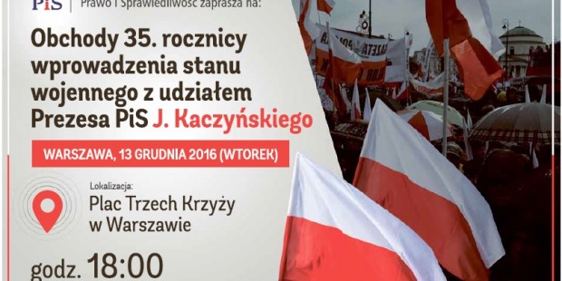 Zapraszamy do wzięcia udziału w manifestacji, która odbędzie się we wtorek 13 grudnia o godz. 18:00 na Placu Trzech Krzyży. Organizatorem manifestacji jest m.in. Prawo i Sprawiedliwość. W manifestacji będzie uczestniczył Jarosław Kaczyński.