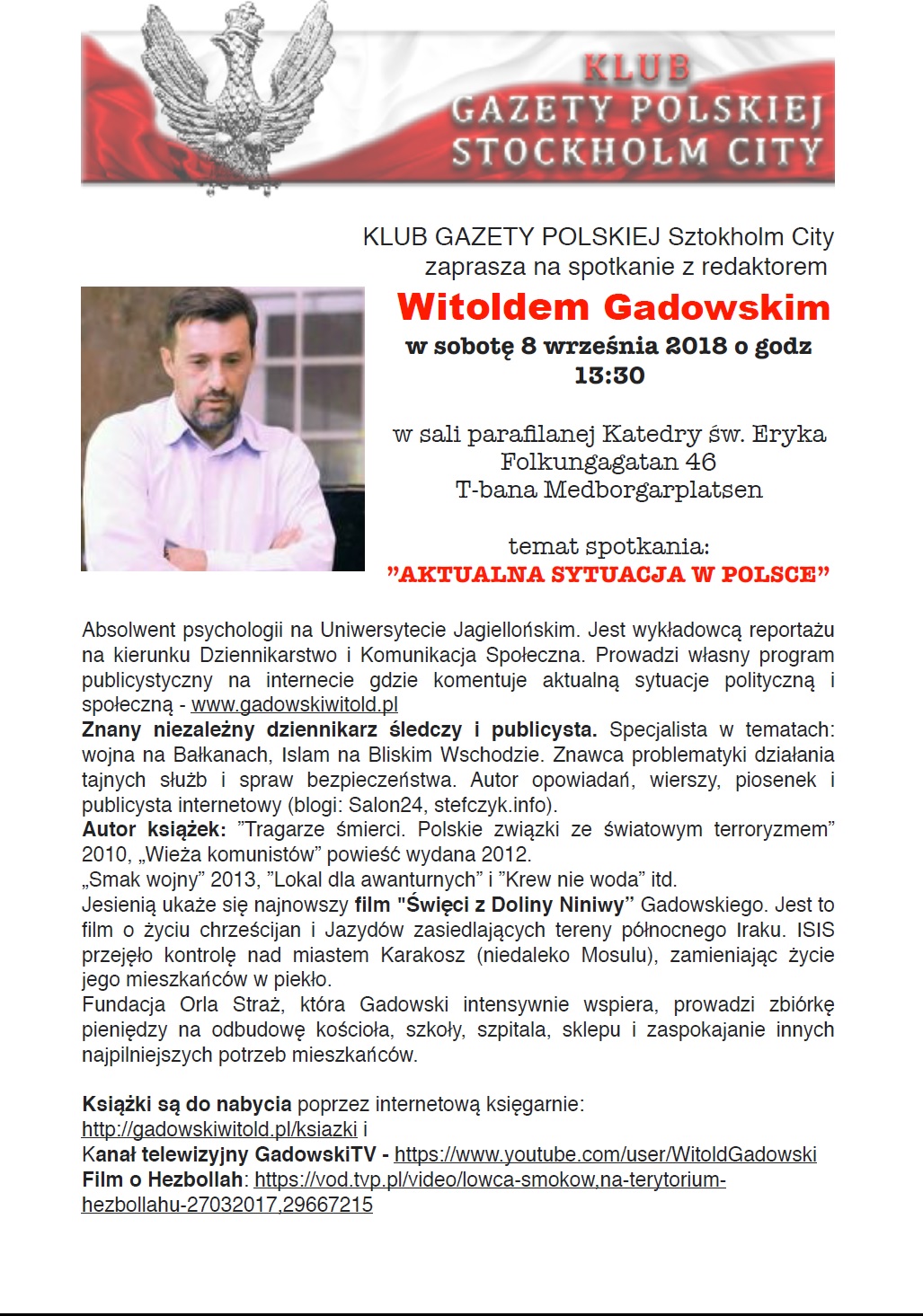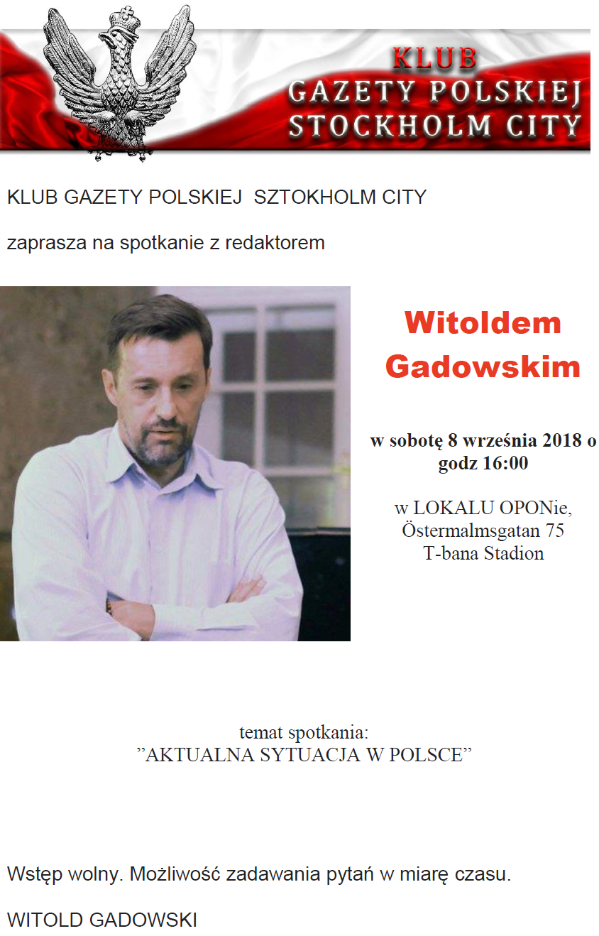 STOCKHOLM CITY – (ZMIANA MIEJSCA I GODZINY) Spotkanie z Witoldem Gadowskim 8 września g.  13.30 w sali parafialnej Katedry św. Eryka Folkungagatan 46  T-bana Medborgarplatsen. Temat spotkania: ”Aktualna sytuacja w Polsce”. Wstęp wolny.