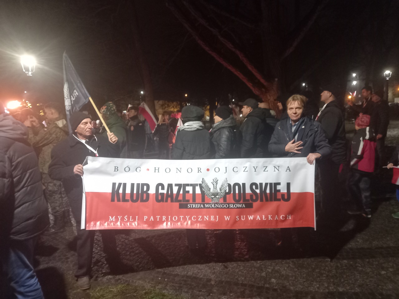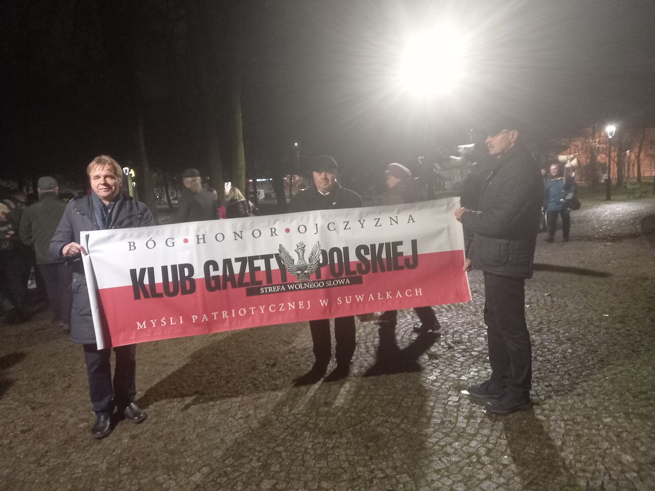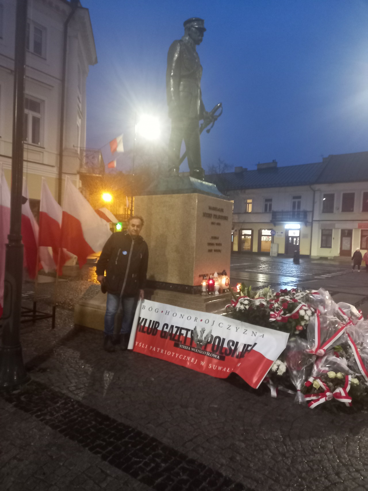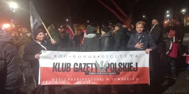 Najpierw odbyła się Msza Św. w konkatedrze św. Aleksandra. Po niej poszliśmy pod pomnik Marszałka Polski Józefa Piłsudskiego – głównego twórcy Niepodległości Polski 11.11.1918 r., gdzie zapaliliśmy biało czerwone znicze z naszym logo: „Bóg- Honor- Ojczyzna Klub Gazety Polskiej- Myśli Patriotycznej w Suwałkach Strefa Wolnego Słowa”.