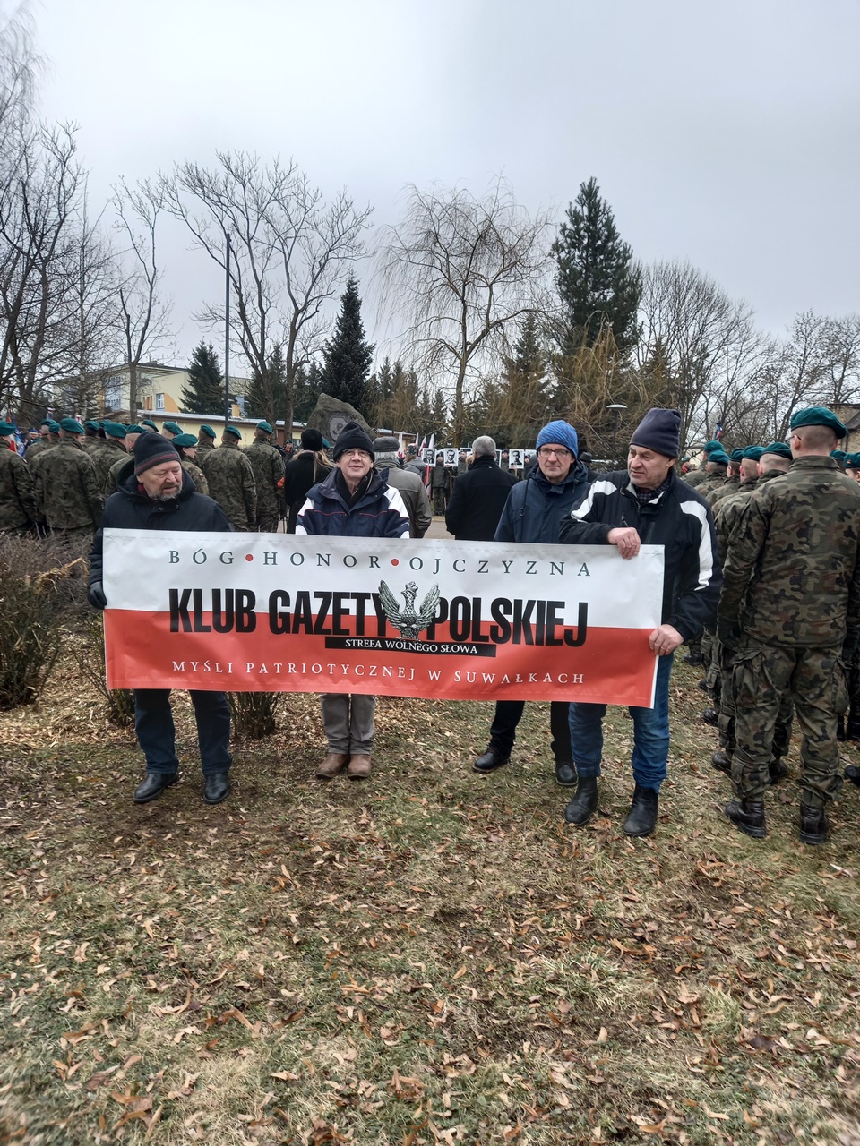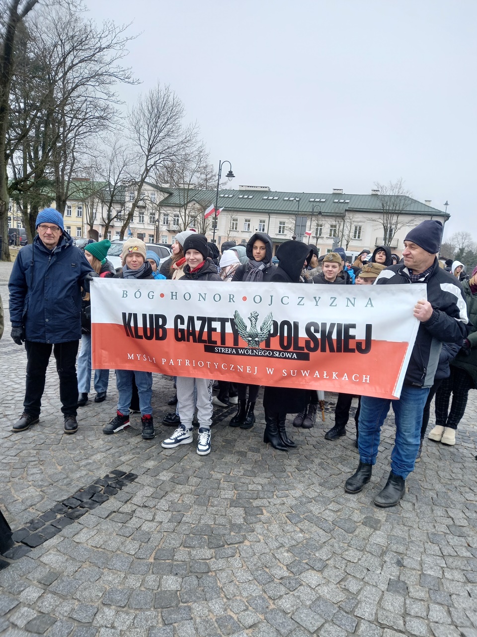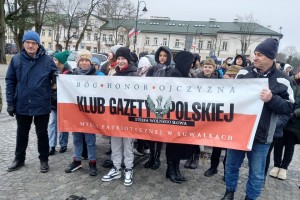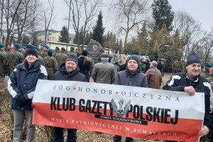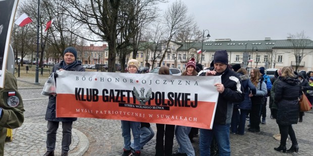 Najpierw była Liturgia Słowa Bożego w konkatedrze św. Aleksandra, a następnie przemarsz ulicami Suwałk pod pomnik Armii Krajowej z naszym patriotycznym banerem i z licznym udziałem młodzieży suwalskich szkół z pocztami sztandarowymi i portretami Żołnierzy Wyklętych. Pod pomnikiem Armii Krajowej zapaliliśmy biało – czerwone znicze z naszym patriotycznym logo: „Bóg – Honor – Ojczyzna Klub Gazety Polskiej – Myśli Patriotycznej w Suwałkach Strefa Wolnego Słowa”.