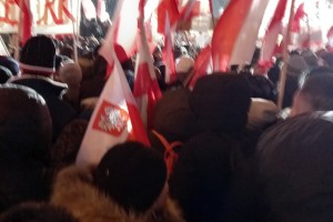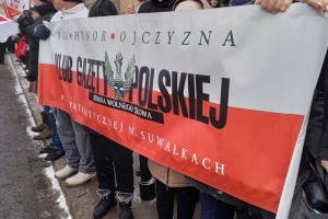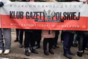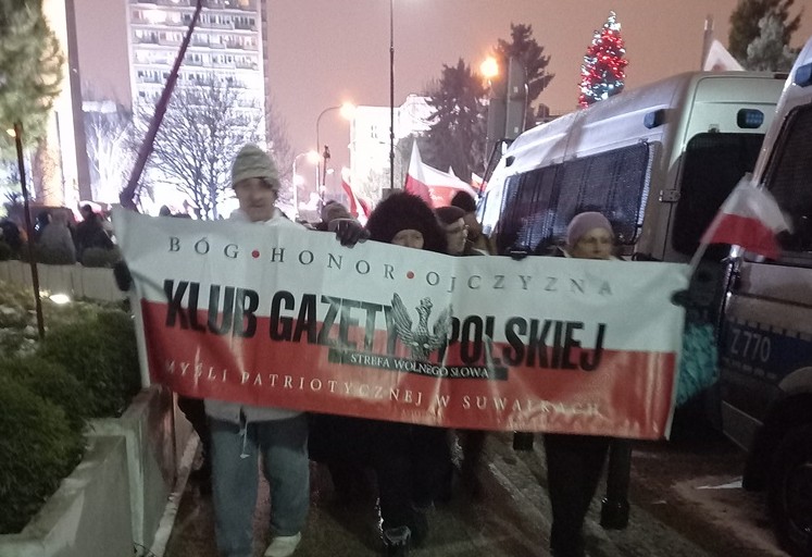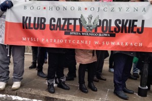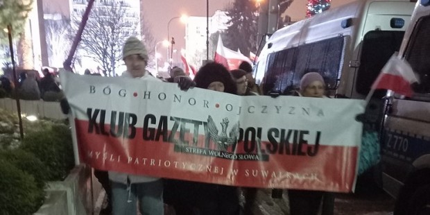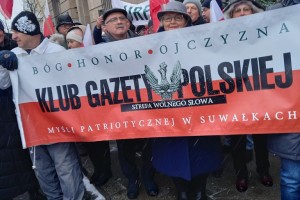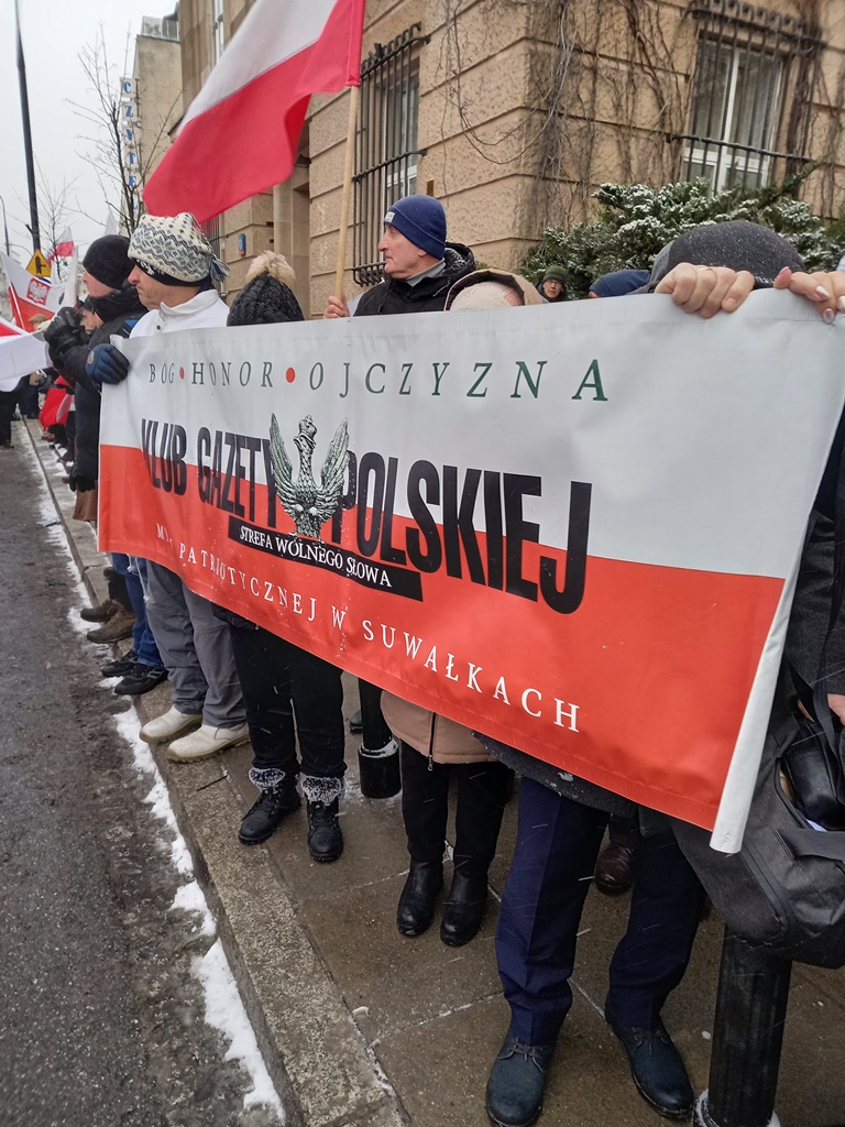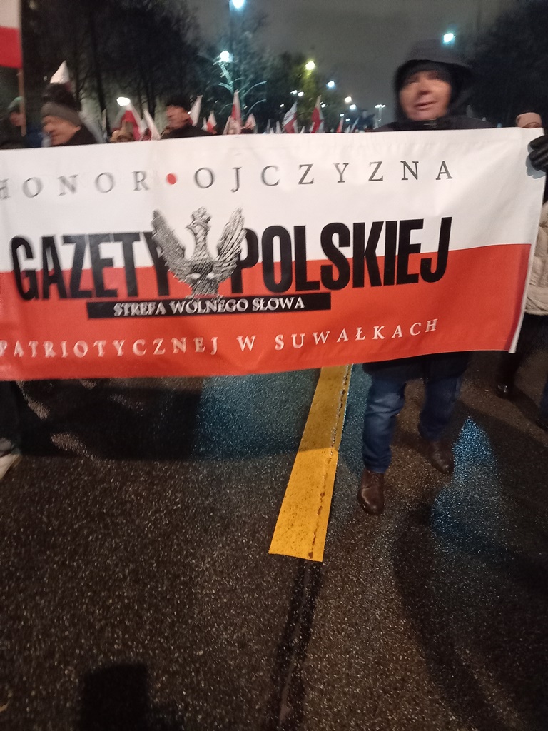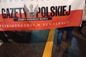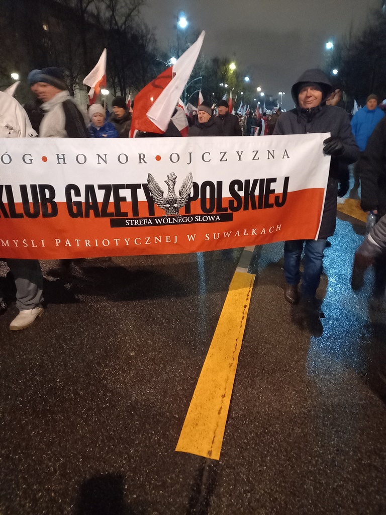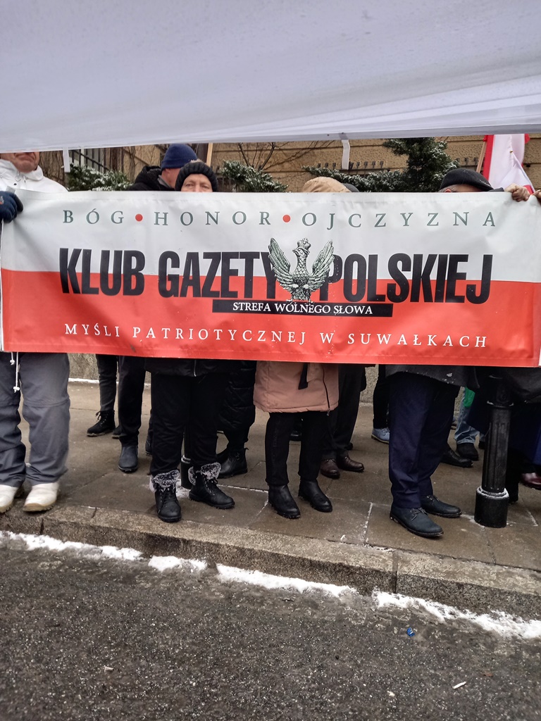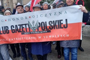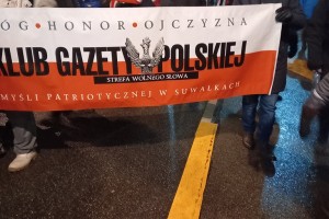 Mieliśmy też oczywiście nasz patriotyczny biało – czerwony baner: „Bóg – Honor – Ojczyzna Klub Gazety Polskiej – Myśli Patriotycznej w Suwałkach Strefa Wolnego Słowa”.