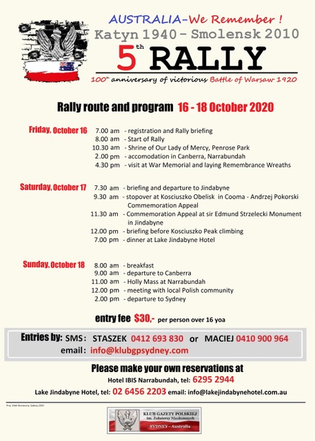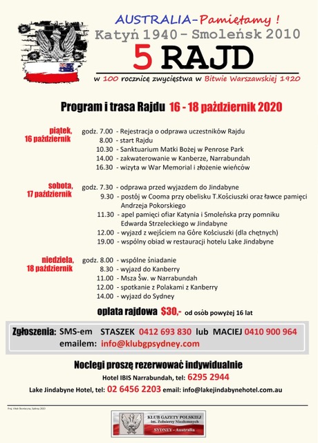 SYDNEY | 5 Rajd Katyń 1940 – Smoleńsk 2010 w 100 rocznicę zwycięstwa w Bitwie Warszawskiej 1920. Australia – Pamiętamy! 5 Rajd Katyń 1940 – Smoleńsk 2010 w 100 rocznicę zwycięstwa w Bitwie Warszawskiej 1920. Australia – Pamiętamy! paź 12, 2020 Kluby GP Sydney (Australia), Sydney II (Australia) Tagged Sydney (Australia), Sydney II (Australia) Wstecz To jest niegodziwe! Dalej SUWAŁKI | Miesięcznica Tragedii Smoleńskiej