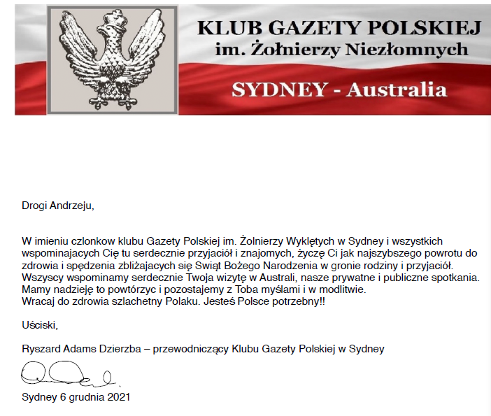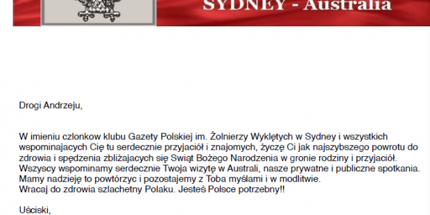W imieniu członków klubu Gazety Polskiej im. Żołnierzy Wyklętych w Sydney i wszystkich wspominających Cię tu serdecznie przyjaciół i znajomych, życzę Ci jak najszybszego powrotu do zdrowia i spędzenia zbliżających się Świąt Bożego Narodzenia w gronie rodziny i przyjaciół.