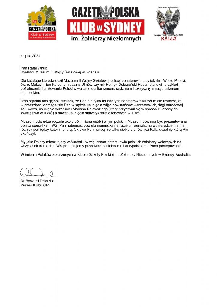 Dziś ogarnia nas głęboki smutek, że Pan nie tylko usunął tych bohaterów z Muzeum ale również, że w przeszłości domagał się Pan w sądzie usunięcia zdjęć powstańców warszawskich, flagi narodowej ze Lwowa, usunięcia wizerunku Mariana Rajewskiego (który przyczynił się w sposób kluczowy do zwycięstwa w II WŚ) a nawet usunięcia statystyk strat osobowych w II WŚ.