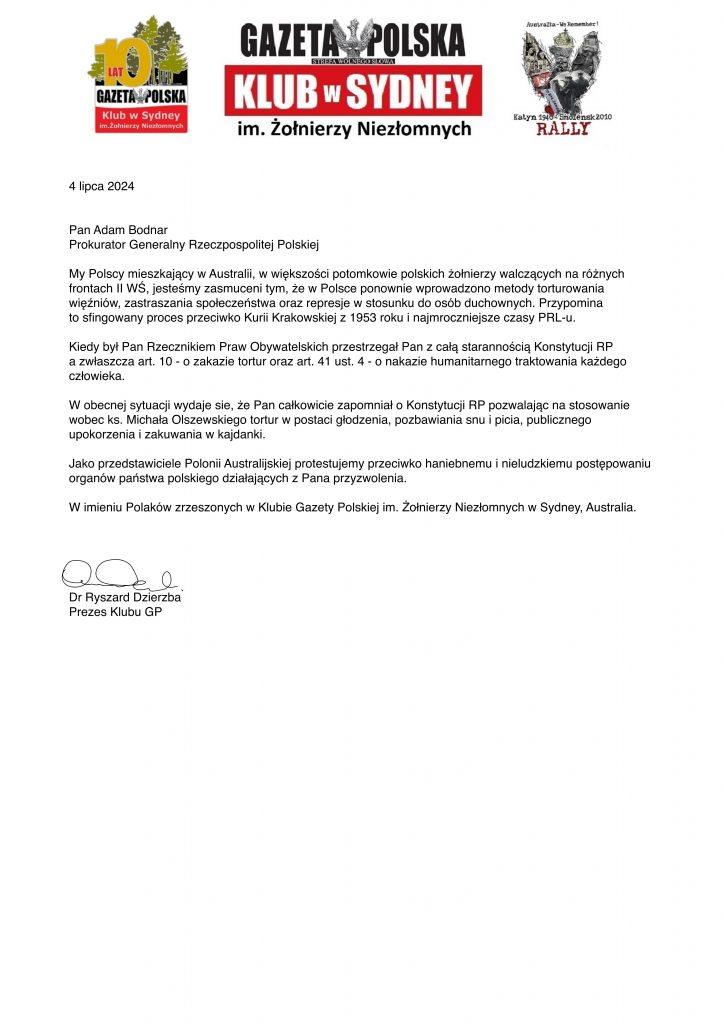My Polscy mieszkający w Australii, w większości potomkowie polskich żołnierzy walczących na różnych frontach II WŚ, jesteśmy zasmuceni tym, że w Polsce ponownie wprowadzono metody torturowania więźniów, zastraszania społeczeństwa oraz represje w stosunku do osób duchownych. Przypomina to sfingowany proces przeciwko Kurii Krakowskiej z 1953 roku i najmroczniejsze czasy PRL-u.