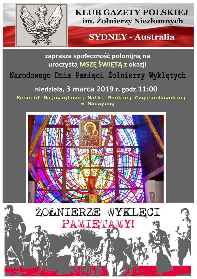 Klub Gazety Polskiej Sydney brał udział w uroczystej Mszy Świętej w Kościele Najświętszej Matki Boskiej Częstochowskiej w Marayong/Sydney zorganizowanej przez Klub Gazety Polskiej im.Żołnierzy Niezłomnych w Sydney z okazji Narodowego Dnia Pamięci Żołnierzy Wyklętych.