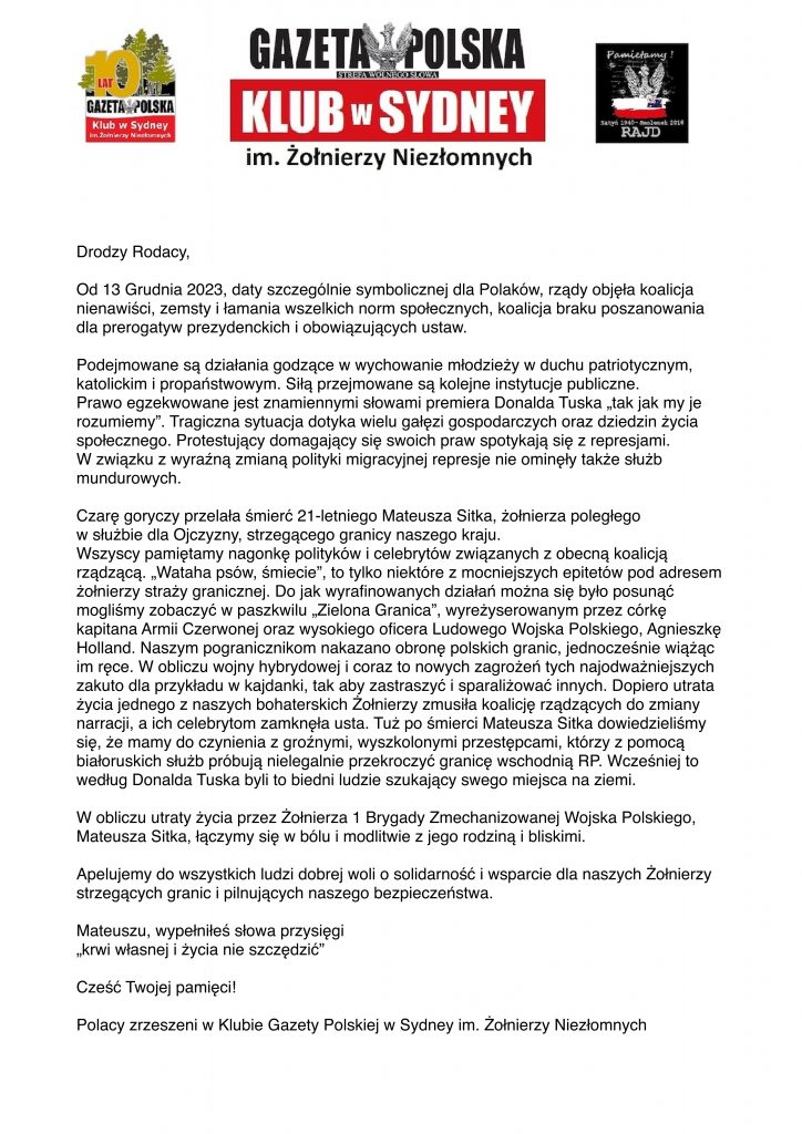 Czarę goryczy przelała śmierć 21-letniego Mateusza Sitka, żołnierza poległego w służbie dla Ojczyzny, strzegącego granicy naszego kraju. Wszyscy pamiętamy nagonkę polityków i celebrytów związanych z obecną koalicją rządzącą. „Wataha psów, śmiecie”, to tylko niektóre z mocniejszych epitetów pod adresem żołnierzy straży granicznej. Do jak wyrafinowanych działań można się było posunąć mogliśmy zobaczyć w paszkwilu „Zielona Granica”, wyreżyserowanym przez córkę kapitana Armii Czerwonej oraz wysokiego oficera Ludowego Wojska Polskiego, Agnieszkę Holland. Naszym pogranicznikom nakazano obronę polskich granic, jednocześnie wiążąc im ręce. W obliczu wojny hybrydowej i coraz to nowych zagrożeń tych najodważniejszych zakuto dla przykładu w kajdanki, tak aby zastraszyć i sparaliżować innych. Dopiero utrata życia jednego z naszych bohaterskich Żołnierzy zmusiła koalicję rządzących do zmiany narracji, a ich celebrytom zamknęła usta. Tuż po śmierci Mateusza Sitka dowiedzieliśmy się, że mamy do czynienia z groźnymi, wyszkolonymi przestępcami, którzy z pomocą białoruskich służb próbują nielegalnie przekroczyć granicę wschodnią RP. Wcześniej to według Donalda Tuska byli to biedni ludzie szukający swego miejsca na ziemi.