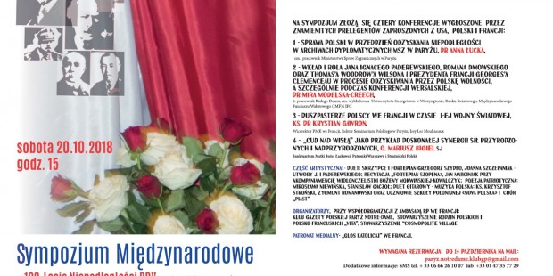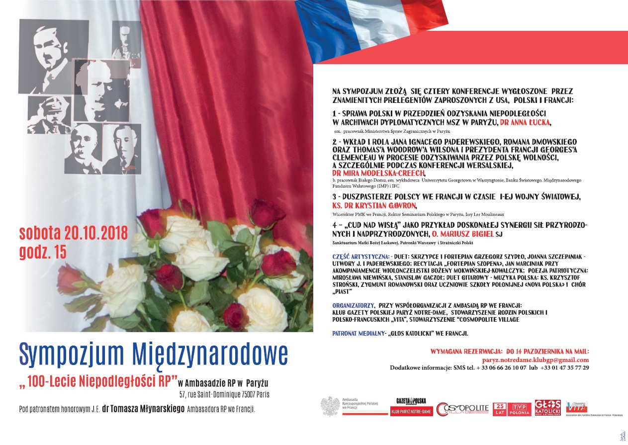 W ramach obchodów 100-lecia Odzyskania Niepodległości Polski,  w Ambasadzie RP w Paryżu, w sobotę 20.10.2018 godz.15 odbędzie się Międzynarodowe Sympozjum pod honorowym patronatem Jego Ekscelencji dr Tomasza Młynarskiego, Ambasadora RP we Francji.