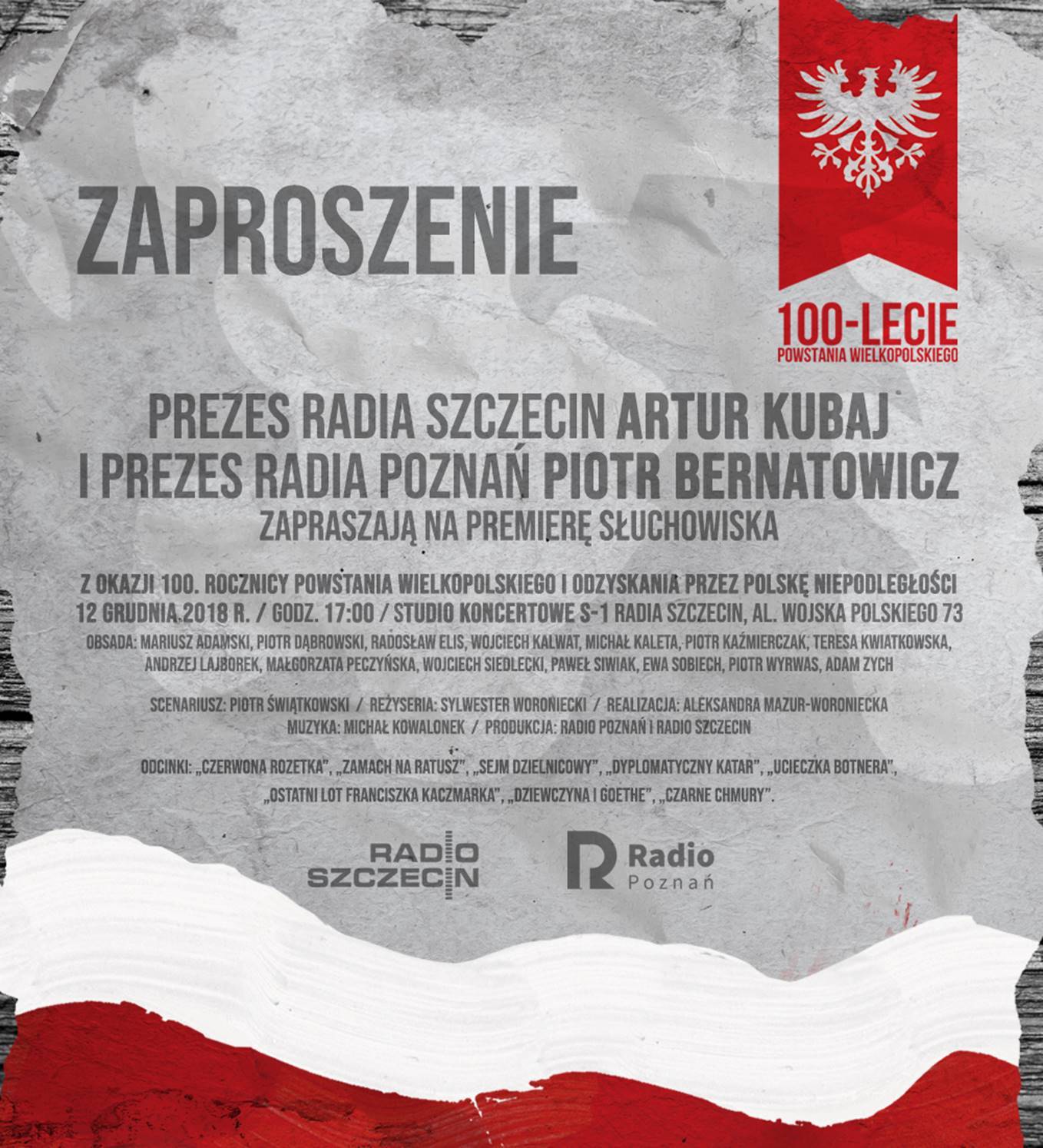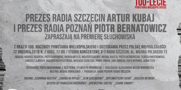 odbędzie się prapremiera słuchowiska z okazji 100. rocznicy Powstania Wielkopolskiego i odzyskania przez Polskę Niepodległości – przygotowanego przez Radio Poznań i Radio Szczecin ; emisja pierwszego odcinka tego słuchowiska planowana jest na dzień 27.12.2018.