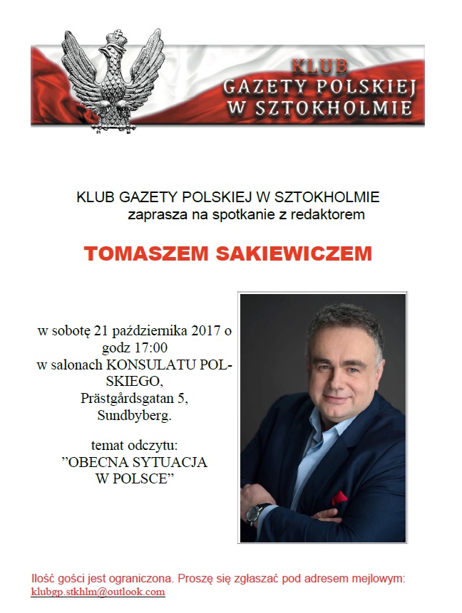 Sztokholm (Szwecji) – spotkanie z red. nacz. „Gazety Polskiej” Tomaszem Sakiewiczem nt. „Obecna sytuacja w Polsce”, 21 października, g. 17 w salonach KONSULATU POLSKIEGO, Prästgårdsgatan 5, Sundbyberg. Ilość gości jest ograniczona, zgłoszenia na email: klubgp.stkhlm@outlook.com