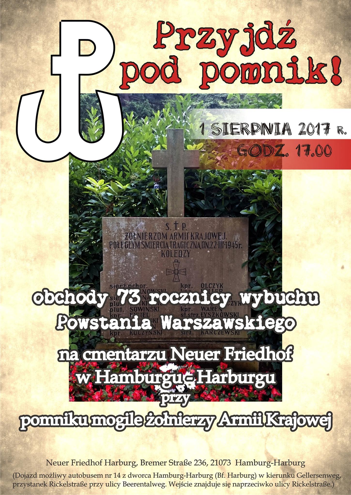 Read More →Zapraszam wszystkich na uroczystości związane z rocznicą wybuchu Powstania Warszawskiego które odbędą się na cmentarzu Neuer Friedhof HH Harburg przy mogile pomniku żołnierzy Armii Krajowej 01.08.2017 o godz. 17,00.