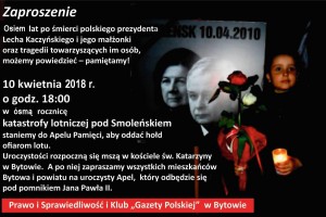 Read More →Bytów – 7. Rocznica tragedii smoleńskiej, 10 kwietnia, g. 18, Msza św. w kościele św. Katarzyny. Po Mszy Apel Pamięci pod pomnikiem Jana Pawła II.