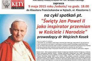Kęty – cykl spotkań pt. „Święty Jan Paweł II jako inspirator przemian w Kościele i Narodzie”,9 maja, g. 18, Klasztor Franciszkanów, ul. Klasztorna 1. Prowadzący dr Wojciech Kosek.