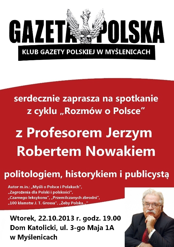 22 października 2013 r. o godz. 19.00 w Domu Katolickim odbyło się otwarte spotkanie zorganizowane przez myślenicki Klub Gazety Polskiej. Tym razem gościem specjalnym był Prof. Jerzy Robert Nowak, znany szczególnie z mediów katolickich politolog,…