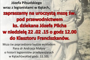 Kęty – Msza św. w 100. rocznicę pobytu Józefa Piłsudskiego w Kętach, 22 lutego, g. 12, do Klasztora Franciszków. Msza św. pod przewodnictwem ks. dziekana Józefa Pilcha poprzedzona będzie wykładem dr. Andrzeja Małysy o historii legionów przebywających…