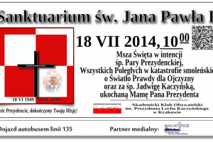 Read More →Kraków – Msza św. w intencji śp. Pary Prezydenckiej oraz wszystkich Ofiar tragedii smoleńskiej oraz za śp. Jadwigę Kaczyńską, 18 lipca, g. 10, Sanktuarium św. Jana Pawła II.
