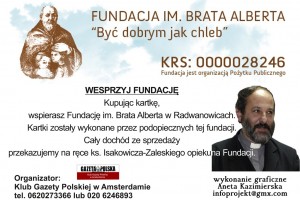 Read More →Od niedzieli 24 listopada do Świat Bożego Narodzenia rozpoczynamy akcje sprzedaży kartek świątecznych wykonanych przez podopiecznych Fundacji im. Brata Alberta w Radwanowicach. Cały dochód ze sprzedaży przekazany zostanie księdzu Isakowiczowi-Zaleskiemu….