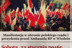 W najbliższą sobotę, 23 stycznia br., o godz. 17 odbędzie się przed budynkiem Ambasady RP w Wiedniu (Hietzinger Hauptstr. 42C, 1130 Wiedeń) manifestacja w obronie rządu i prezydenta RP. Klub GP im. rtm. W. Pileckiego, jako członek Porozumienia…