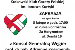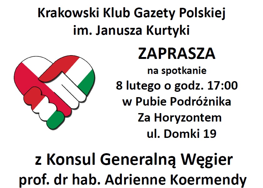 Kraków – spotkanie z Konsul Generalną Węgier – prof. dr hab. Adrienne Kormendy, 22 lutego, g. 17 w pubie „Za Horyzontem”, ul. Domki 19.