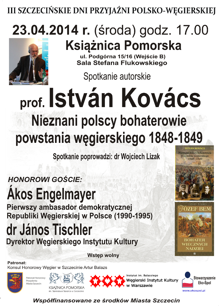 Szczecin – spotkanie autorskie z prof. Istvanem Kovacsem poświęcone powstaniu węgierskiemu 1848-49, 23 kwietnia, g. 17 do Książnicy Pomorskiej w sali Stefana Flukowskiego (wejście B).