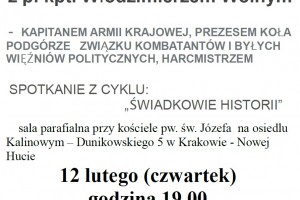 Kraków – Nowa Huta – spotkanie z cyklu: „Świadkowie Historii” z p. kpt. Włodzimierzem Wolnym, Kapitanem Armii Krajowej, Prezesem Koła Podgórze Związku Kombatantów I Byłych Więźniów politycznych, Harcmistrzem, 19 marca, g. 19,…