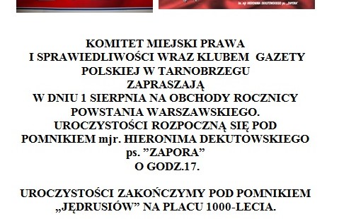Tarnobrzeg – Obchody Rocznicy Powstania Warszawskiego, 1 sierpnia, g. 17. lip 22, 2013 Kluby GP Tarnobrzeg Tagged Powstanie warszawskie, Tarnobrzeg Wstecz Kilka słów o księdzu Lemańskim Dalej Nasze miasto – Ucieczka do Europy