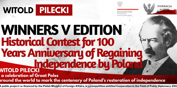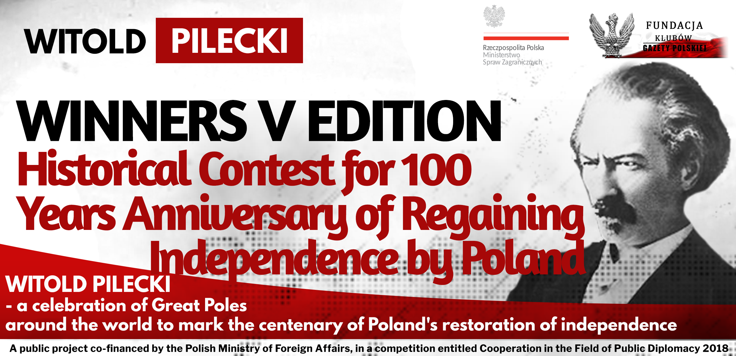 The Winners – V edition Historical Contest for 100 Years Anniversary of Regaining Independence by Poland The Winners 1. Mr Andrzej Brzezik – Album book about Polish history 2. Mrs Barbara Świerczek – Music disc with patriotic music paź 17, 2018 Kluby GP Fundacja Klubów "Gazety Polskiej", WITOLD PILECKI – A CELEBRATION OF GREAT POLES Tagged konkurs Wstecz Wybory samorządowe 2018 r.- KATOWICE Dalej WYNIKI KONKURSU: WITOLD PILECKI – V EDYCJA Konkursu Historycznego na 100-lecie odzyskania przez Polskę Niepodległości