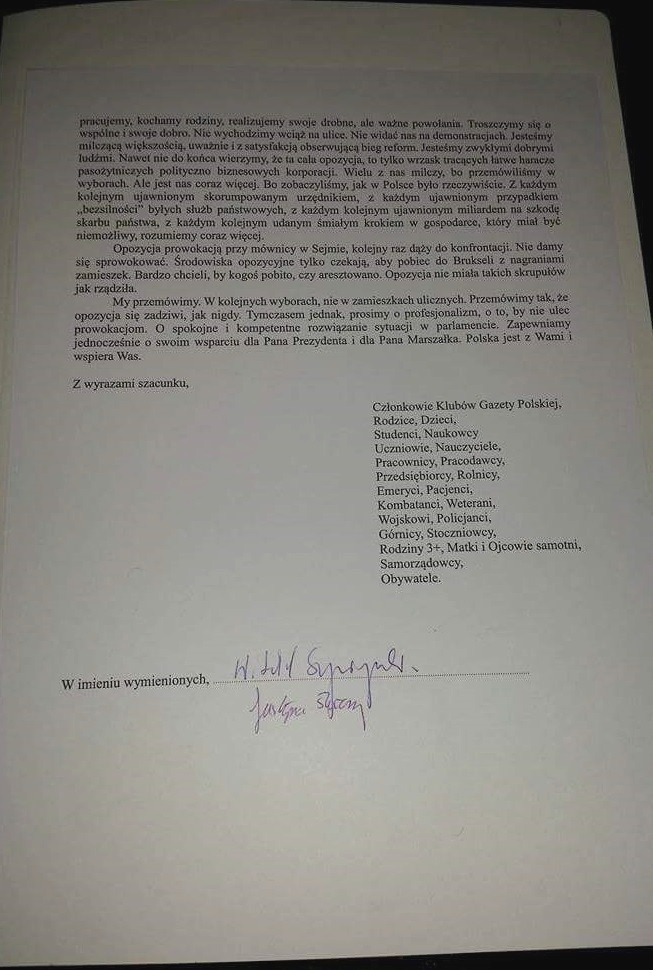 Treść listu, który został przekazany Prezydentowi RP Andrzejowi Dudzie oraz Marszałkowi Joachimowi Brudzińskiemu