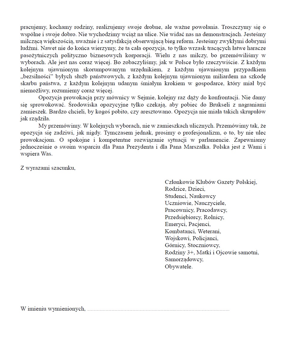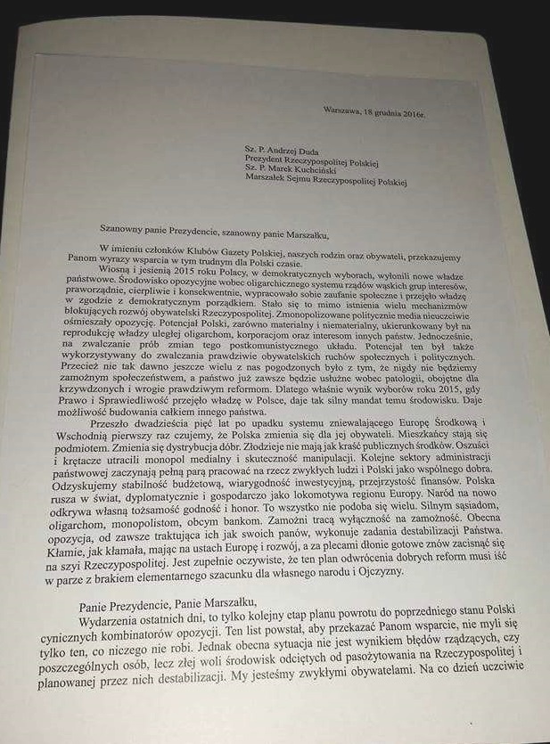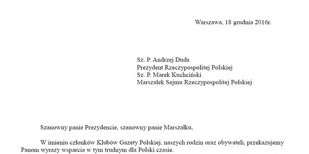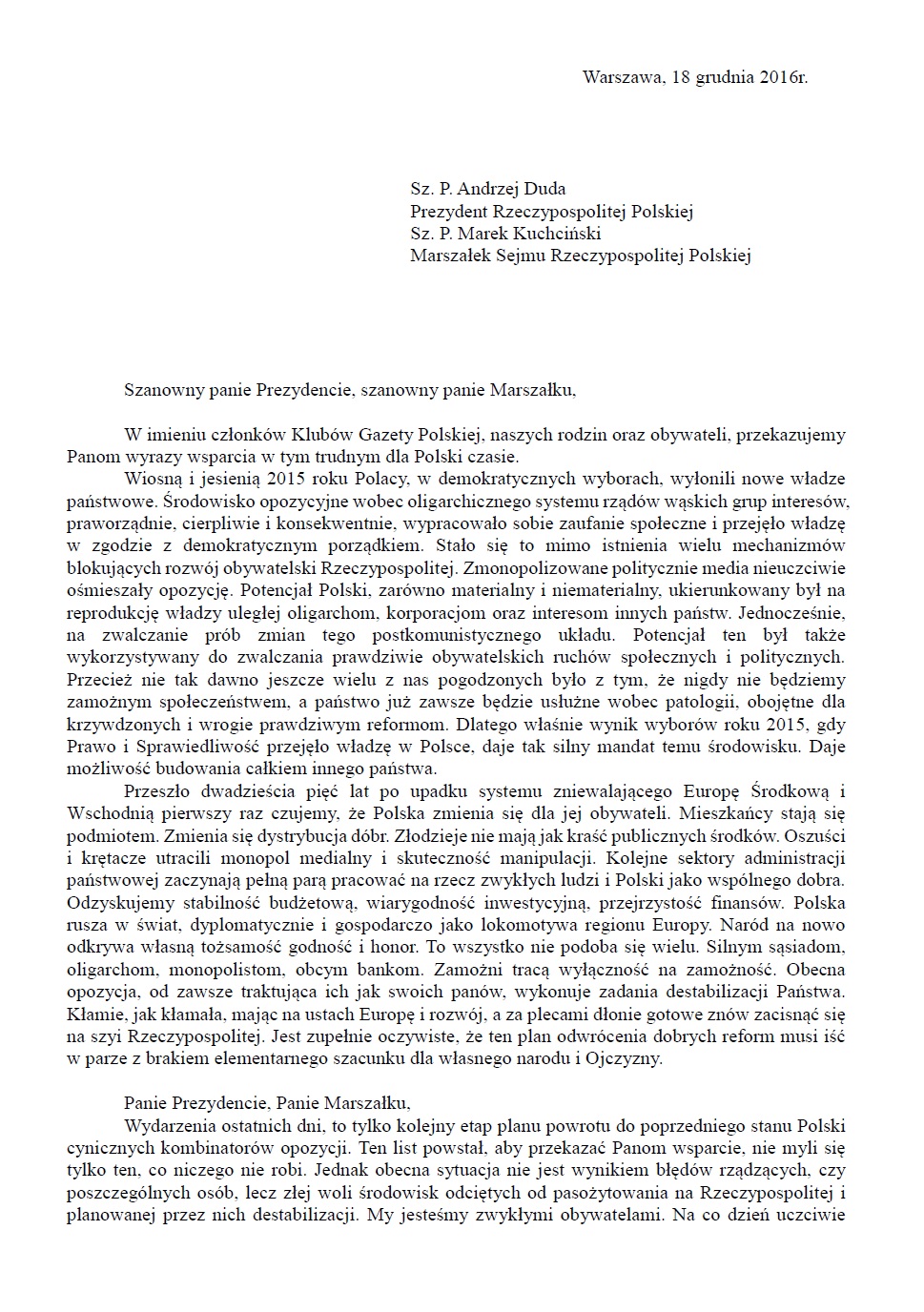Kancelaria wyraziła serdeczne podziękowania Klubom „Gazety Polskiej” oraz uczestnikom zgromadzenia za wyrażenie poparcia dla Rządu oraz Prezydenta RP. Prosili również o przekazanie, że to poparcie jest bardzo potrzebne i może być ważne w nadchodzącym czasie.