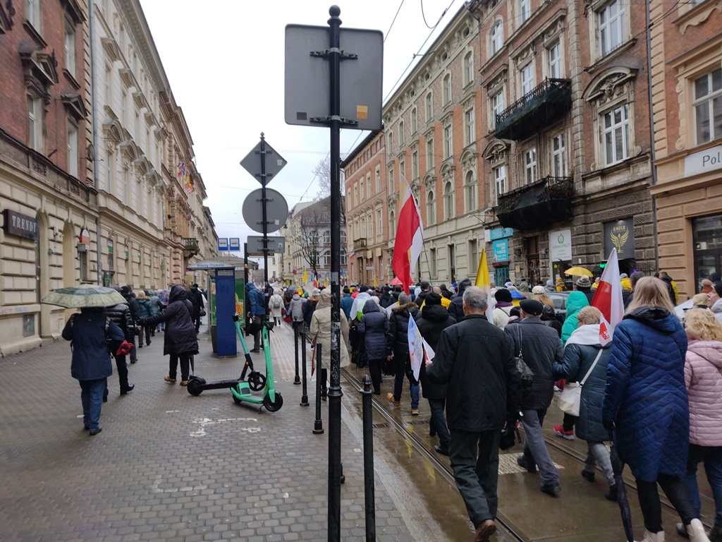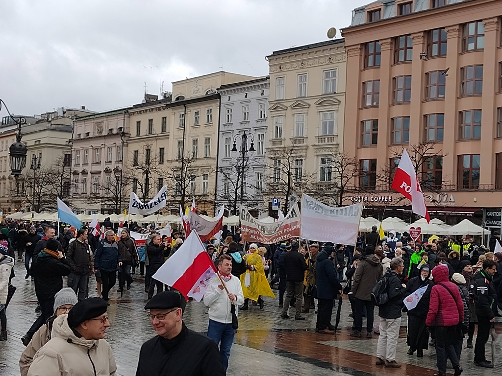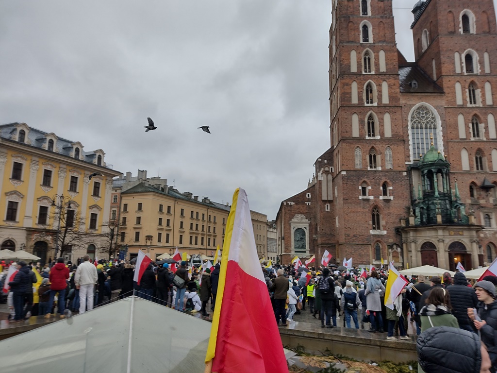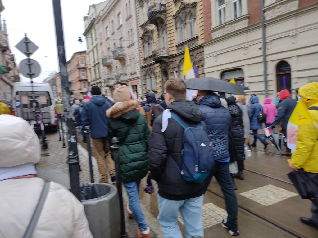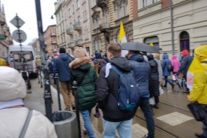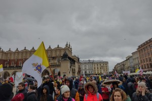 Znaleźliśmy się wśród tysięcy ludzi, którzy wyrazili swój sprzeciw dla szargania godności i świętości Jana Pawła II. Pomimo złej pogody, deszczu i słoty, tysiące ludzi wypełniło krakowskie ulice. Z krakowskich Błoni ulicami miasta z modlitwą na ustach, doszliśmy na Rynek, gdzie rozpoczęła się msza Święta.