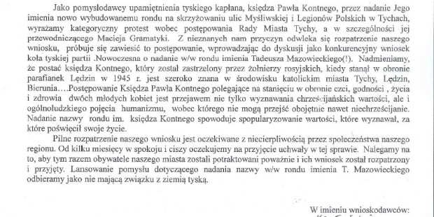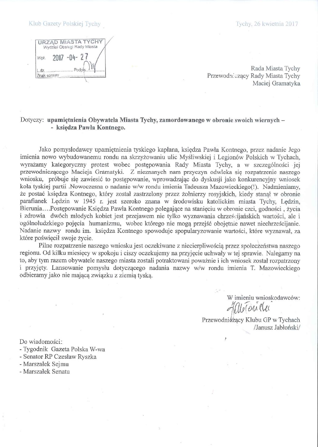 W styczniu tego roku klub Gazety Polskiej w Tychach w porozumieniu z innymi środowiskami prawicowymi w naszym mieście poprzez radną z którą na stałe klub  współpracuje Ewę Węglarz złożył projekt uchwały o nadaniu nowo wybudowanemu  rondu w Tychach  imienia Rondo im. Ks. Pawła Kontnego.   Ksiądz Paweł Kontny to nasz lokalny bohater, który zginął w 1945 roku z rąk sowieckich żołnierzy (został zastrzelony) ponieważ stanął w obronie czci i cnoty, dwóch młodych kobiet napastowanych przez sowieckiego żołnierza.  Postawa, którą ten młody kapłan się wykazał zasługuje na najwyższy szacunek i uznanie nie tylko  środowisk chrześcijańskich, ale w swoim wymiarze stanowi przykład najwyższego  poświęcenia dla drugiego człowieka, charakteryzuje  się poszanowaniem jego godności i pragnieniem oszczędzenia mu cierpienia.  To najlepszy przykład uniwersalnego  humanizmu jaki znamy.   Niestety tyscy Radni Rady Miasta ( z wyjątkiem radnych prawicy) nie chcą nawet głosować nad tym projektem.  W  lutym  i w marcu głosowanie nad tym projektem uchwały zostało zdjęte z  obrad Rady Miasta.  W   tym tygodniu dowiedzieliśmy się również, że planuje się wycofanie tego projektu. W październiku ubiegłego roku zgłoszono inny projekt nazwania ronda im. Tadeusza Mazowieckiego, jednak pomysł ten nie został przez nikogo podjęty.  Teraz został jednak ponownie „odgrzany”.   Najgorszym jednak jest fakt że Rada Miasta nie potrafi zając stanowiska w tak prostej sprawie.  Skoro taka sprawa powoduje „niemoc” w radzie miasta, należy się zastanowić jak rzetelnie prowadzone są inne sprawy w naszym powiecie a Tychy są jednym z najbogatszych powiatów. Tuż przed dzisiejszą sesją Rady Miejskiej w imieniu Klubu Gazety Polskiej i innych osób  z naszego środowiska  które podpisały się pod projektem, złożyłem pismo do Przewodniczącego Rady oraz Rady Miasta. Pismo do Państwa wiadomości w załączeniu.  Projekt poparło wielu ludzi, zrzeszonych i niezrzeszonych Tyszan w tym najaktywniejszy w naszym regionie parlamentarzysta  Senator Czesław Ryszka.  Zwracamy się do Państwa w tej sprawie o wsparcie, szczególnie wsparcie duchowe tego projektu.  Szczególnego wsparcia wymaga również nasza radna Ewa Węglarz, która za swoje zaangażowanie w promowanie wartości chrześcijańskich narażona jest na nieprzyjemności a nawet ostracyzm ze strony niektórych radnych w naszym mieście.