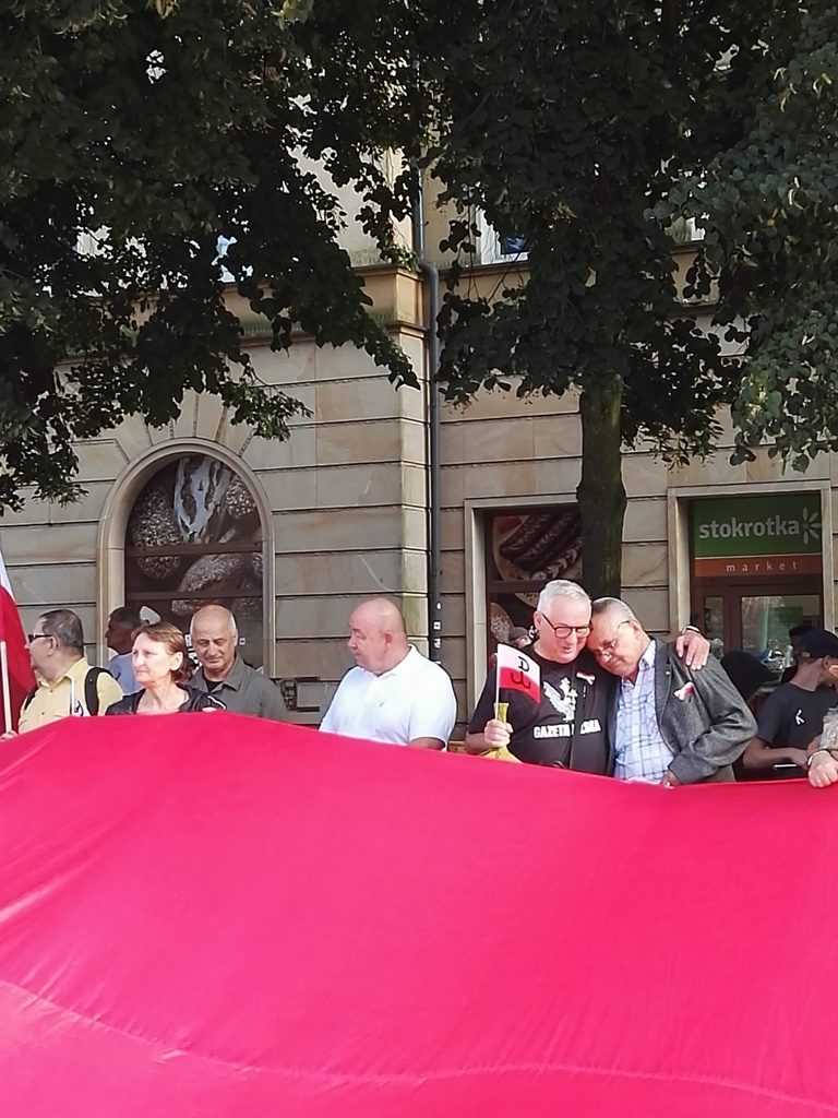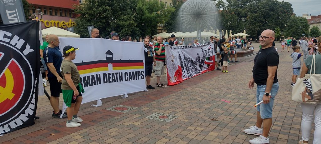 Kibice zaprezentowali również banery z hasłami: „GKS Tychy Precz Z Komuną”, „German Death Camps” oraz baner poświęcony Żołnierzom Podziemia Niepodległościowego – Żołnierzom Wyklętym. Kiedy zabrzmiały syreny, wzdłuż flagi odpalono race, które spowiły cały Plac Baczyńskiego białym dymem. Po zakończeniu syren odśpiewano cztery zwrotki hymnu narodowego, a następnie wzniesiono okrzyki „Cześć i chwała bohaterom”.