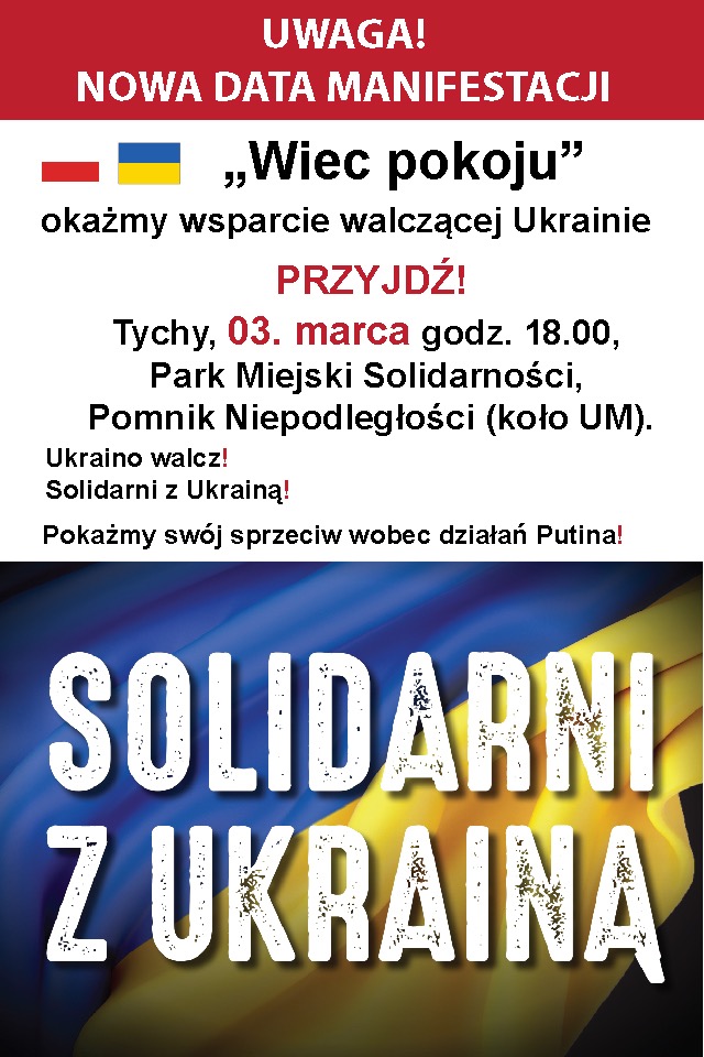 TYCHY | ZAPROSZENIE na WIEC POKOJU, okażmy wsparcie walczącej Ukrainie. 3 marca godz. 18:00 Klub Gazety Polskiej Tychy zaprasza na Wiec pokoju – okażmy wsparcie walczącej Ukrainie. PRZYJDŹ! Tychy 03 marca godz. 18:00 Park Miejski Solidarności, Pomnik Niepodległości (koło UM). mar 1, 2022 Kluby GP KlubyGP, Tychy Tagged Tychy, Ukraina Wstecz KRAKÓW | Pomoc Ukrainie Dalej Polacy już tacy są!