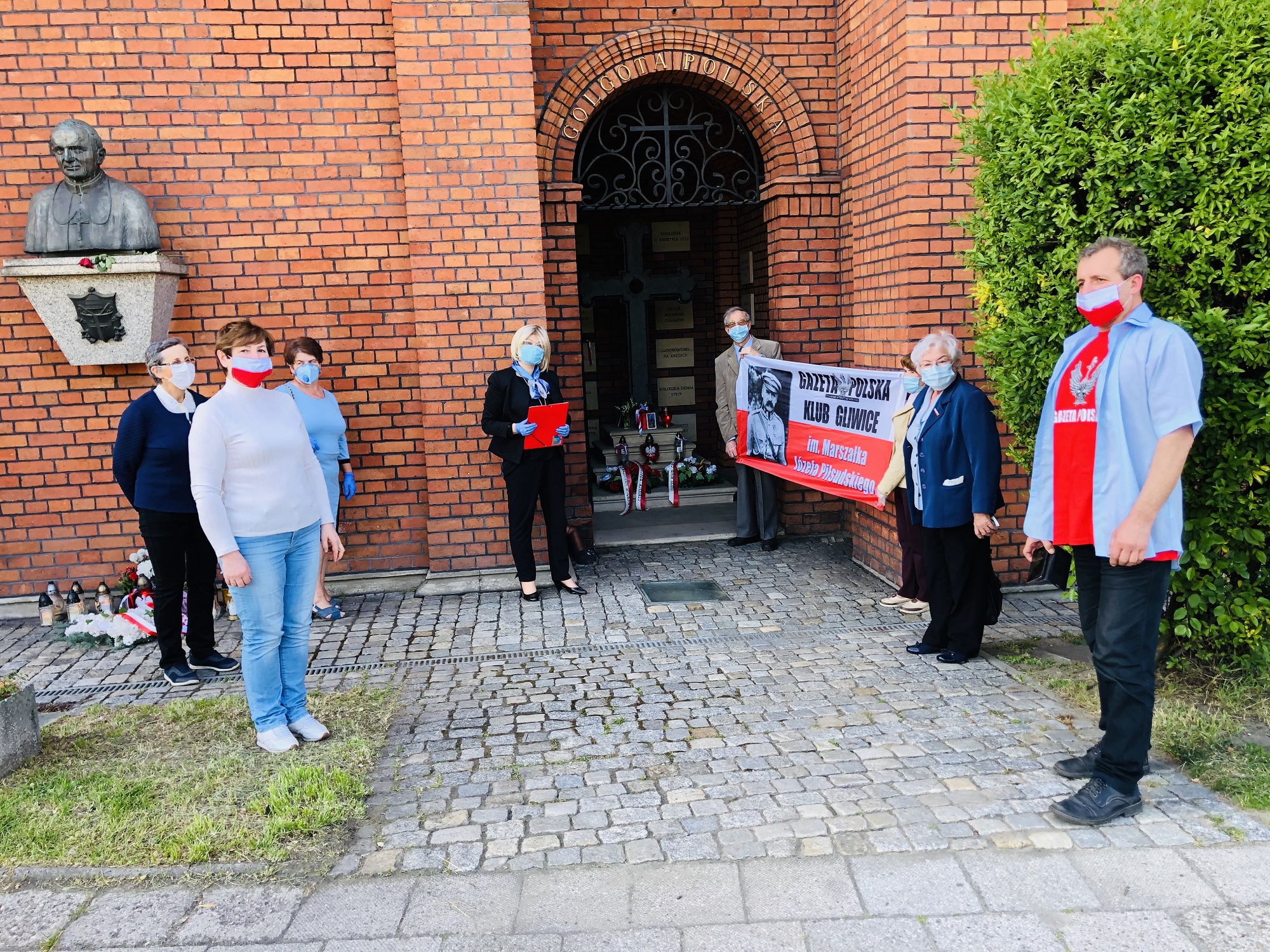 Przedstawiciele Klubu „GP” w Pabianicach upamiętnili rocznicę śmierci Marszałka Józefa Piłsudskiego. Równocześnie zgodnie z wytycznymi podczas epidemii koronawirusa  chodzą z chustami na twarzy, reklamującymi Klub „GP” Pabianice.