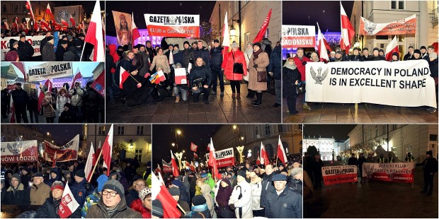 Tylko 24. godziny wystarczyły członkom Klubów „Gazety Polskiej” do zorganizowania dużej manifestacji w obronie demokracji i poparcia rządu RP, która odbyła się przed Pałacem Prezydenckim. Podczas demonstracji w której uczestniczyło około 5 tys. osób głos zabrał m.in. wicepremier Piotr Gliński, który zwracając się do klubowiczów powiedział: „Polska potrzebuje demokracji i wy jesteście solą tej demokracji. To dzięki wam Polska się zmienia i polski rząd stabilnie i odpowiedzialnie prowadzi rozwój kraju”. Dziękując w imieniu rządu powiedział: „Za waszą postawę obywatelską, za waszą aktywność obywatelską. To wy jesteście prawdziwym polskim społeczeństwem obywatelskim. Dziękujemy!” Wicemarszałek Joachim Brudziński zapewnił zebranych, że: „Nie zabraniamy opozycji protestów i manifestacji. Niech sobie chodzą, niech protestują, ale na warcholstwo i na nocną zmianę wart nie pozwolimy”. Natomiast były działacz opozycji antykomunistycznej Adam Borowski stwierdził: „Demokratycznie wybrana władza odda władzę wyłącznie za pomocą kartki wyborczej. I niech oni wiedzą, że tej władzy nie będzie bronić wyłącznie ustawowo do tego upoważniona policja, że tej władzy będą bronić również wyborcy tej władzy”. „Polska jest wolnym krajem. To jest oaza wolności w tej chwili w Europie. Wszyscy musimy pilnować tej wolności” – mówił prezes Reduty Dobrego Imienia Maciej Świrski. Na zakończenie głos zabrał red. Tomasz Sakiewicz, który powiedział: „Nie udało im się, nie obalą tego rządu, nie obalą tego prezydenta, nie przewrócą demokracji. Ale jest jeden warunek – my nie możemy się cofnąć, nie możemy być zadowoleni. Polska to jest stały obowiązek. Polska wymaga stałej troski, Polska wymaga stałej walki”. W imieniu zgromadzonych na wiecu Justyna i Witold Szpiczyńscy przekazali bezpośrednio w Kancelarii Prezydenta list zaadresowany do Pana Prezydenta RP Andrzeja Dudy, oraz do Marszałka Sejmu Marka Kuchcińskiego. Kopia listu została przekazana na ręce pana Joachima Brudzińskiego. Kancelaria wyraziła serdeczne podziękowania Klubom „Gazety Polskiej” oraz uczestnikom zgromadzenia za wyrażenie poparcia dla Rządu oraz Prezydenta RP. Proszono również o przekazanie, że to poparcie jest bardzo potrzebne i może być ważne w nadchodzącym czasie.