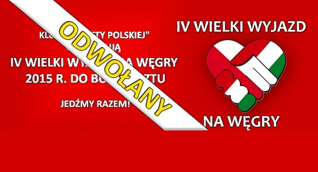 Z przykrością informujemy, że IV Wielki Wyjazd na Węgry organizowany przez Kluby „Gazety Polskiej” został odwołany. Najważniejszym powodem podjęcia takiej decyzji było nasze przeświadczenie, że wyjazd do Budapesztu na Święto Narodowe Węgrów będzie wykorzystany do ataków na Kluby „Gazety Polskiej” i na całe środowisko Strefy Wolnego Słowa. Wykorzystają ten fakt przede wszystkim ci wszyscy, którzy do tej pory wiernie służyli Władimirowi Putinowi i w każdy możliwy sposób tępili słowa prawdy jakie padały z naszej strony na temat polityki Rosji wobec Polski i innych krajów. Nasz wyjazd na Węgry zostałby przedstawiony jako proputinowska akcja i utożsamienie się z polityką Kremla. Tych z Państwa, którzy zdecydują się jechać (proszę nie brać klubowych banerów) namawiam do złożenia kwiatów pod pomnikiem gen J. Bema (Bem tér) i pod Pomnikiem Katyńskim (naprzeciwko Árpád Gimnázium, Nagyszombat u. 19). Możecie również skorzystać Państwo z hotelu Ventura który miał być naszą bazą noclegową.