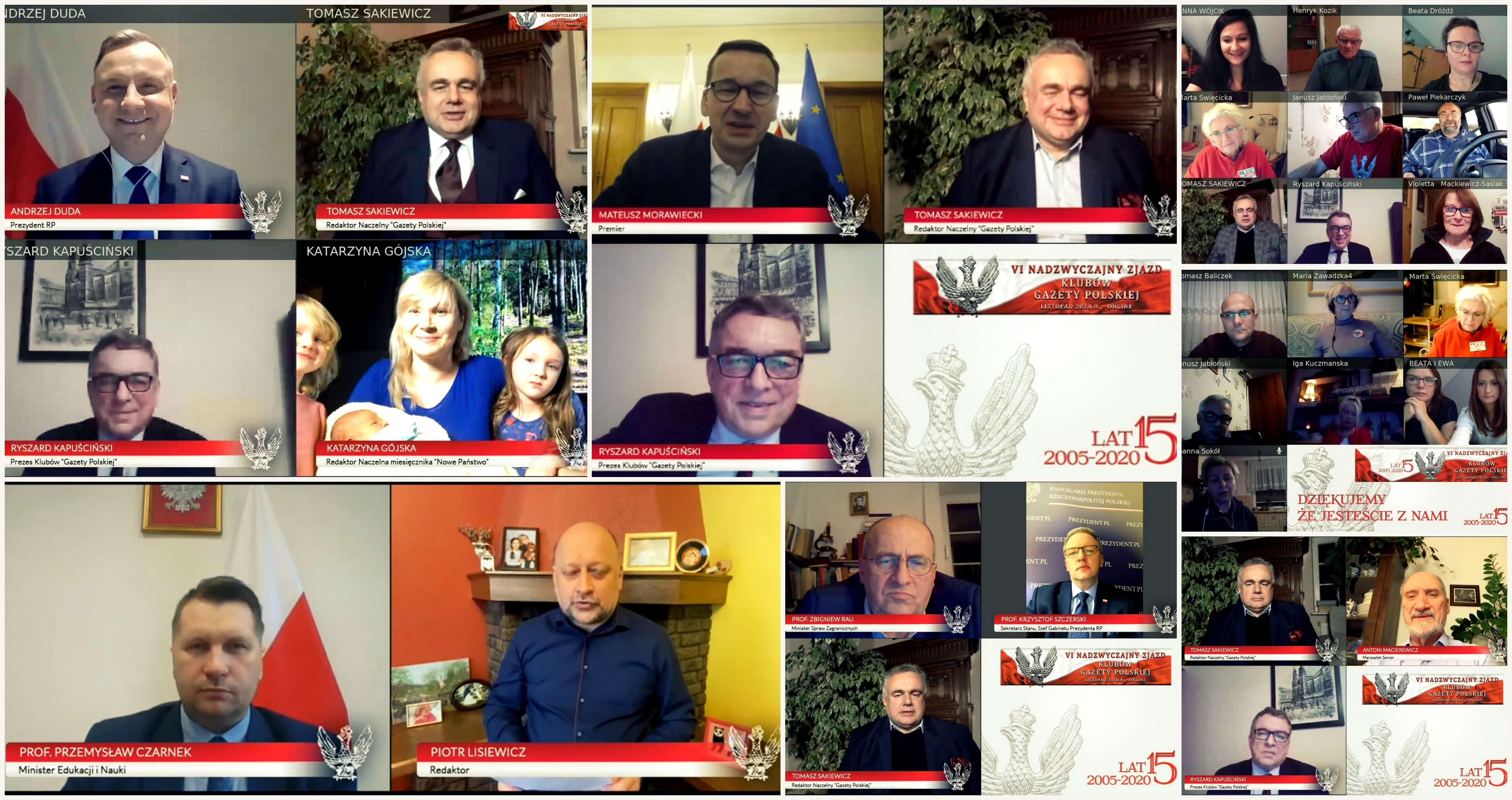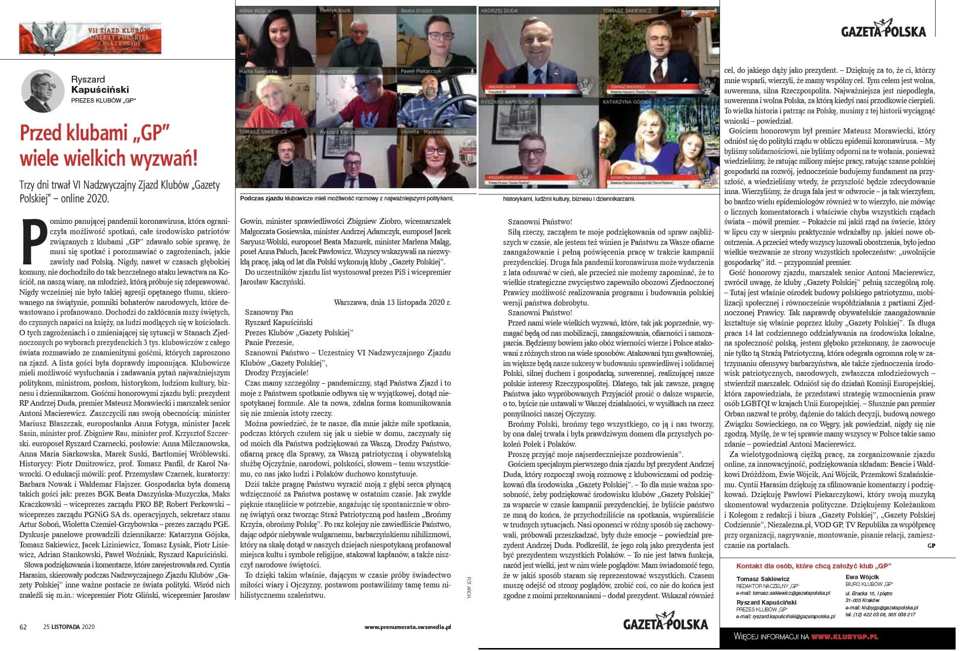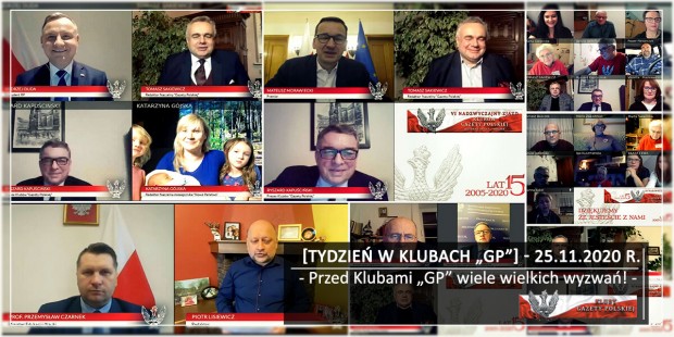 Przez trzy dni trwał VI Nadzwyczajny Zjazd Klubów „Gazety Polskiej” – online 2020, pomimo panującej pandemii koronawirusa, która ograniczyła możliwość spotkań całe środowisko patriotów związanych z klubami „GP” zdawało sobie sprawę, że musi się spotkać i porozmawiać o wyjątkowych zagrożeniach jakie zawisły nad Polską. Nigdy, nawet w czasach głębokiej komuny nie dochodziło do tak bezczelnego ataku lewactwa na Kościół, na naszą wiarę, na młodzież, którą próbuje się zdeprawować. Nigdy wcześniej nie było takiej agresji opętanego tłumu, skierowanego na świątynie, pomniki bohaterów narodowych, które dewastowano i profanowano. Dochodzi do zakłócania mszy świętych, do czynnych napaści na księży, na ludzi modlących się w kościołach. O tych zagrożeniach i o zmieniającej się sytuacji w Stanach Zjednoczonych po wyborach prezydenckich ze znamienitymi gośćmi, których zaproszono na zjazd, przez trzy dni, rozmawiało tysiące klubowiczów z całego świata. A lista gości była doprawdy imponująca. Klubowicze mieli możliwość wysłuchania i zadania pytań najważniejszym politykom, ministrom, posłom, historykom, ludziom kultury, biznesu i dziennikarzom, Gośćmi honorowymi zjazdu byli: prezydent RP Andrzej Duda, premier Mateusz Morawiecki i marszałek senior Antoni Macierewicz. Zaszczycili nas swoją obecnością: minister Mariusz Błaszczak, europoseł Anna Fotyga, minister Jacek Sasin, minister prof. Zbigniew Rau, minister prof. Krzysztof Szczerski. europoseł Ryszard Czarnecki, posłowie: Anna Milczanowska, Anna Maria, Marek Suski, Bartłomiej Wróblewski. Historycy: Piotr Dmitrowicz, prof. Tomasz Panfil, dr Karol Nawrocki. O edukacji mówili: prof. Przemysław Czarnek, kuratorzy: Barbara Nowak i Waldemar Flajszer. Gospodarka była domeną takich gości jak: prezes BGK, Beata Daszyńska – Muzyczka, Maks Kraczkowski – wiceprezes zarządu PKO BP, Robert Perkowski – wiceprezes zarządu PGNiG SA ds. Operacyjnych, sekretarz stanu Artur Soboń, Wioletta Czemiel-Grzybowska – prezes Zarządu PGE. Dyskusje panelowe prowadzili dziennikarze: Katarzyna Gójska, Tomasz Sakiewicz, Jacek Liziniewicz, Tomasz Łysiak, Piotr Lisiewicz, Adrian Stankowski, Paweł Woźniak, Ryszard Kapuściński.