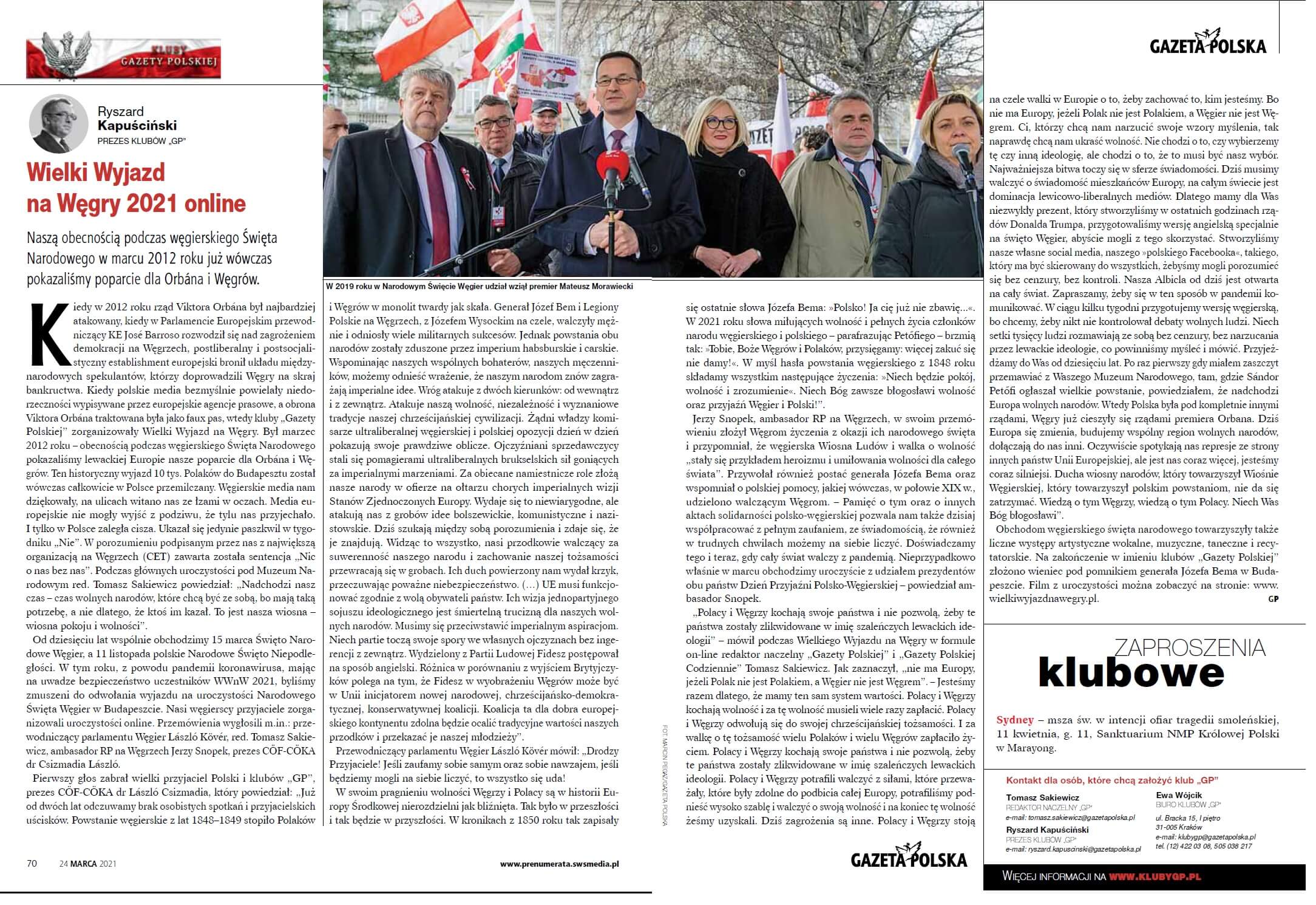 Od dziesięciu lat wspólnie obchodzimy 15 marca Święto Narodowe Węgier, a 11 listopada polskie Narodowe Święto Niepodległości. W tym roku, z powodu pandemii koronawirusa, mając na uwadze bezpieczeństwo uczestników WWnW 2021, byliśmy zmuszeni do odwołania wyjazdu na uroczystości Narodowego Święta Węgier w Budapeszcie. Nasi węgierscy przyjaciele zorganizowali uroczystości on-line. Przemówienia wygłosili m.in.: przewodniczący parlamentu Węgier László Kövér, red. Tomasz Sakiewicz, ambasador RP na Węgrzech Jerzy Snopek, prezes CÖF-CÖKA dr Csizmadia László.