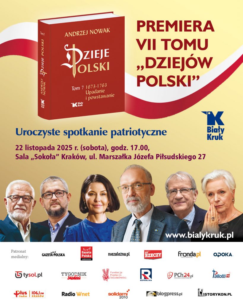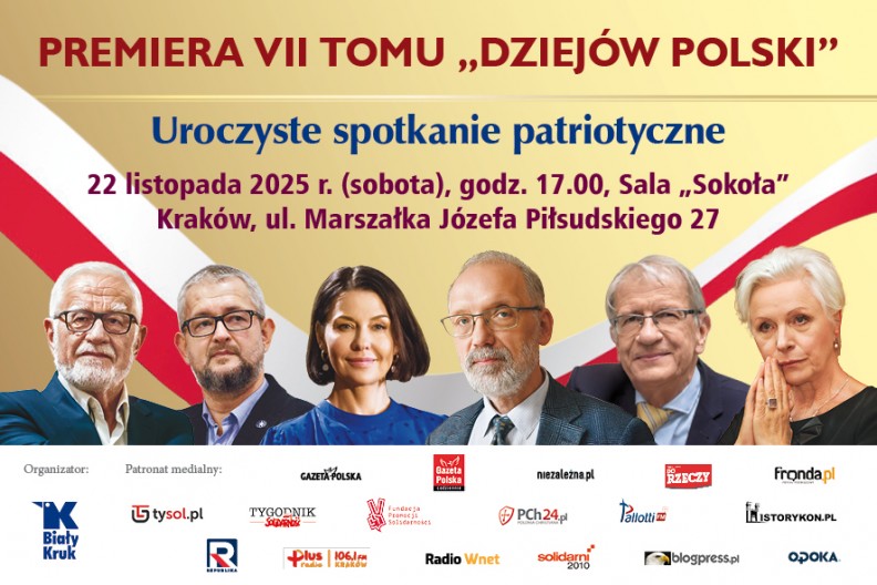 Premiera VII tomu „Dziejów Polski” odbędzie się 22 listopada 2025 r. w Sali „Sokoła” w Krakowie, przy ul. Marszałka Piłsudskiego 27. Wydarzenie poprowadzi red. Anna Popek; początek o godz. 17.00.