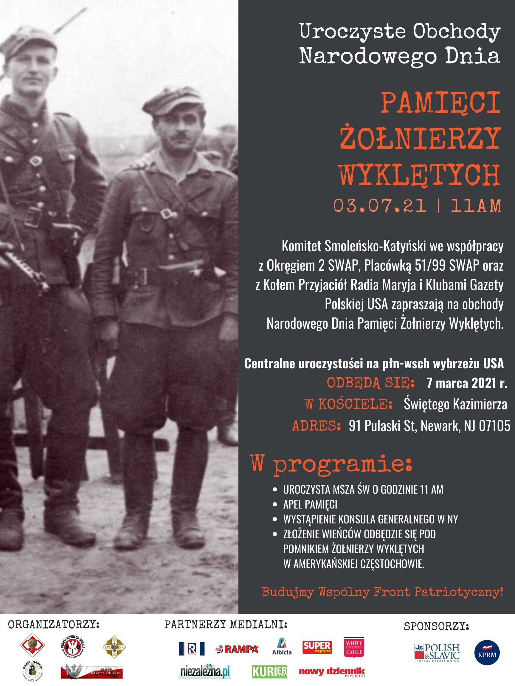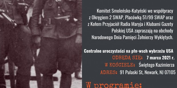 Komitet Smoleńsko-Katyński we współpracy z Okręgiem 2 SWAP, Placówką 51/99 SWAP oraz z Kołem Przyjaciół Radia Maryja i Klubami Gazety Polskiej USA zapraszają na Obchody Narodowego Dnia Pamięci Żołnierzy Wyklętych.